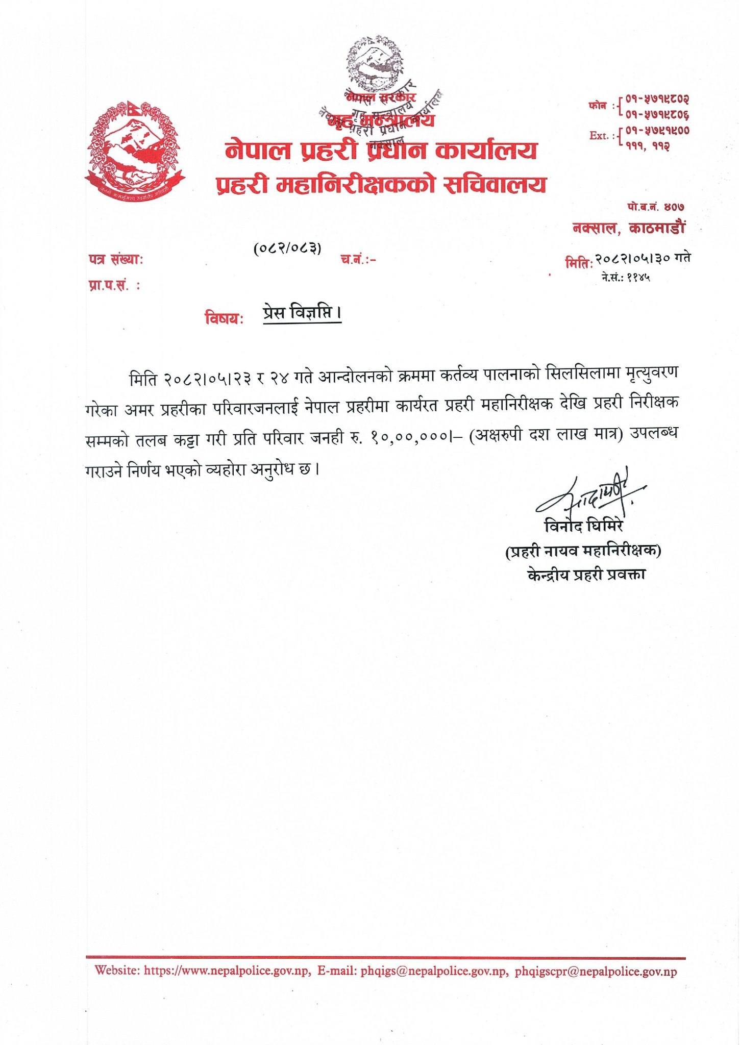 प्रहरी नायव महानिरीक्षक (डीआइजी) विनोद घिमिरेले विज्ञप्ति जारी गर्दै इन्सपेक्टरदेखि आईजीपीसम्मको तलबबाट मृतक प्रहरीका परिवारलाई जनही १० लाख दिने निर्णय भएको हो ।