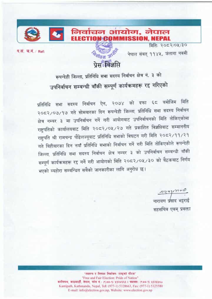 रूपन्देही क्षेत्र नम्बर ३ को उपनिर्वाचनसम्बन्धी सम्पूर्ण कार्यक्रमहरू रद्द
