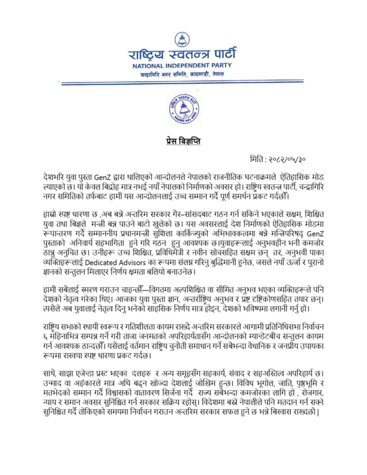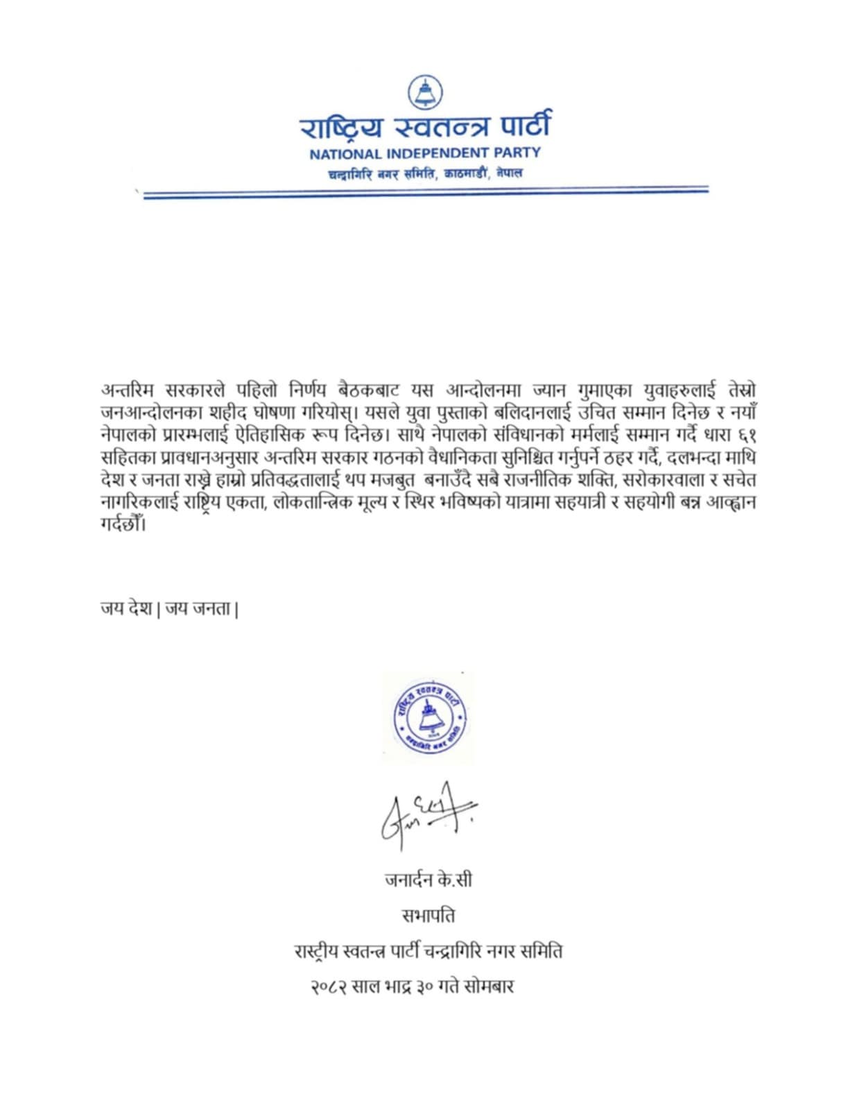 सोमबार (भदाै ३०) रास्वपाद्वारा जारी भएको विज्ञप्तिमा अन्तरिम सरकारले पहिलो निर्णय बैठकबाट आन्दोलनमा ज्यान गुमाएका युवाहरूलाई तेस्रो जनआन्दोलनका शहीद घोषणा गरिनुपर्ने साथै नेपालको संविधानको मर्मलाई सम्मान गर्दै धारा ६१ सहितका प्रावधानअनुसार अन्तरिम सरकार गठनको वैधानिकता सुनिश्चित गर्नुपर्ने ठहर गर्दै, दलभन्दा माथि देश र जनता राख्ने प्रतिबद्धता जनाइएको छ।