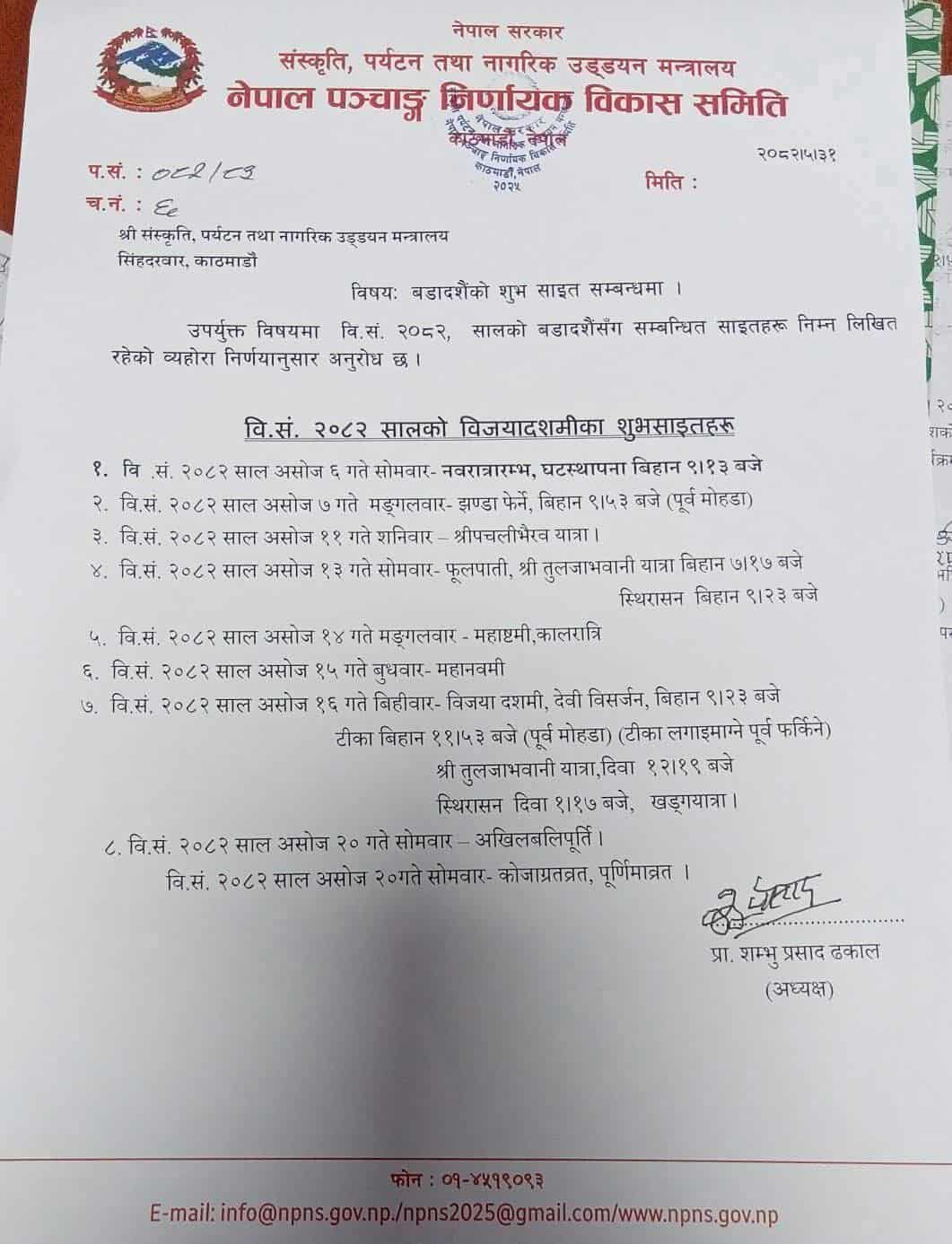 नेपाल पञ्चाङ्ग निर्णायक विकास समितिले यस वर्षको दसैँका विभिन्न साइत सार्वजनिक गरेको छ ।