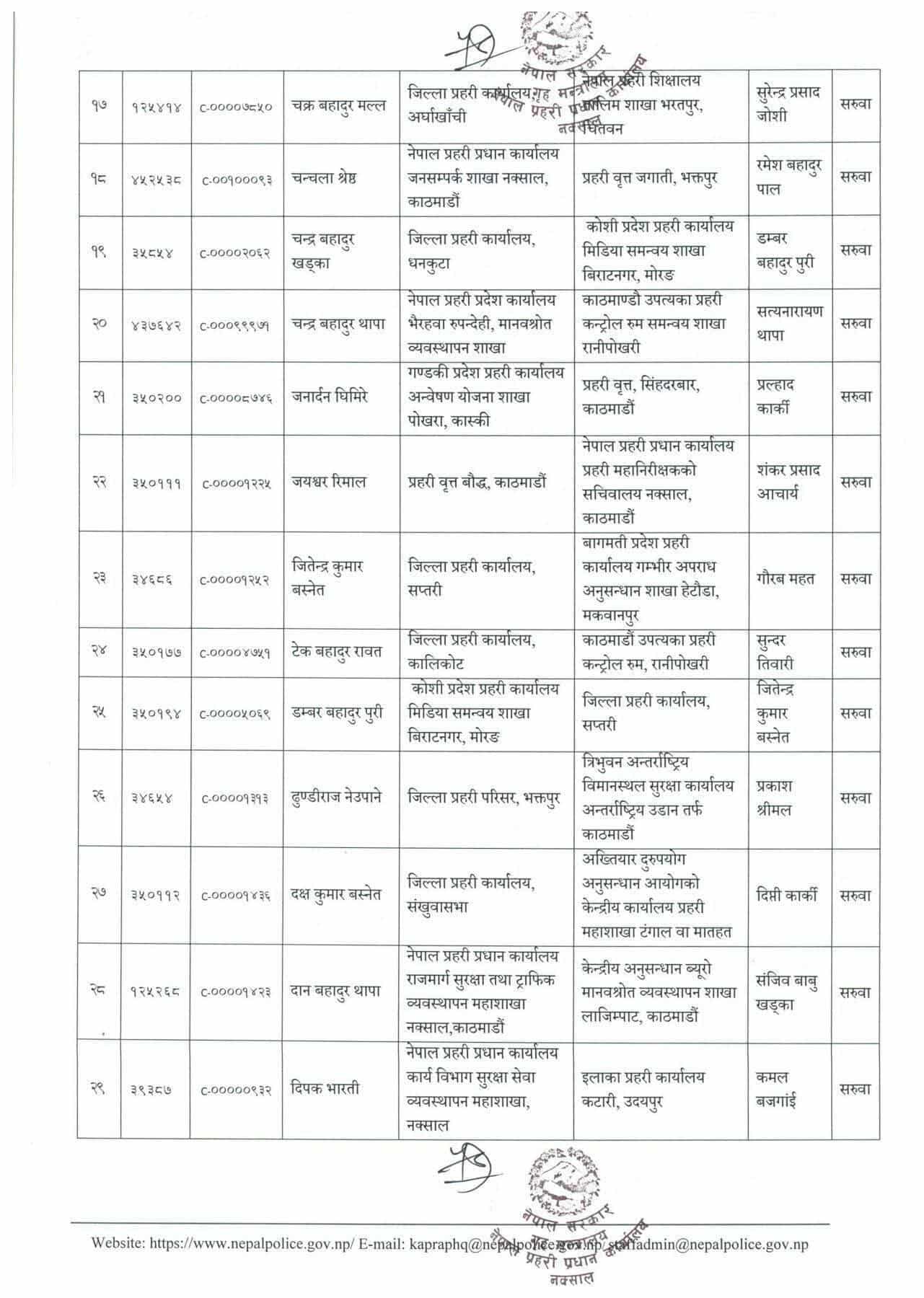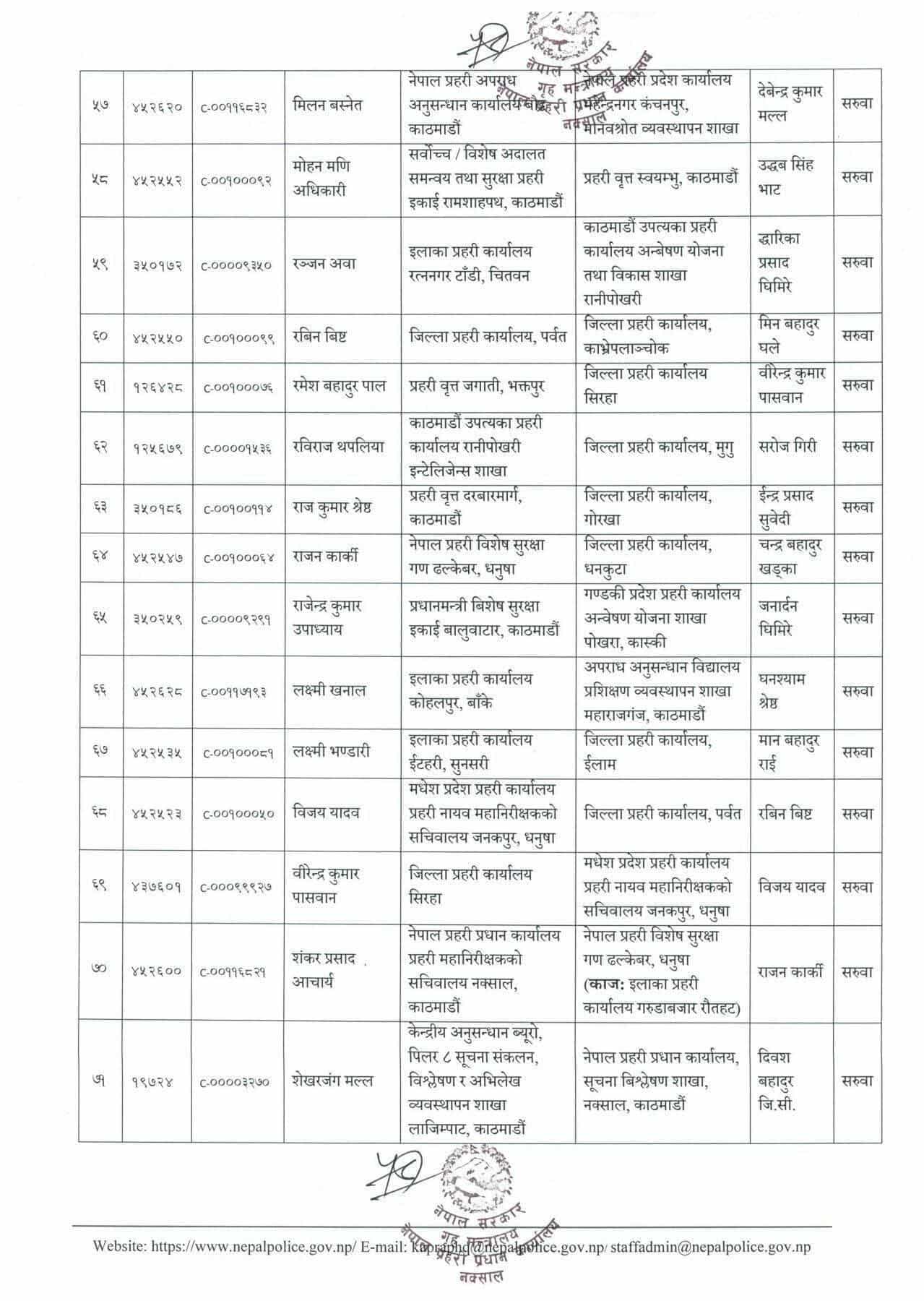 प्रहरी महानिरीक्षकको भदौ ३१ गतेको निर्णयानुसार असोजदेखि तलब, भत्तासमेत हाल सरुवा भएको दरबन्दीवाट खान पाउने गरी सरुवा/काज भएको मानवश्रोत विकास विभागले जनाएको छ ।