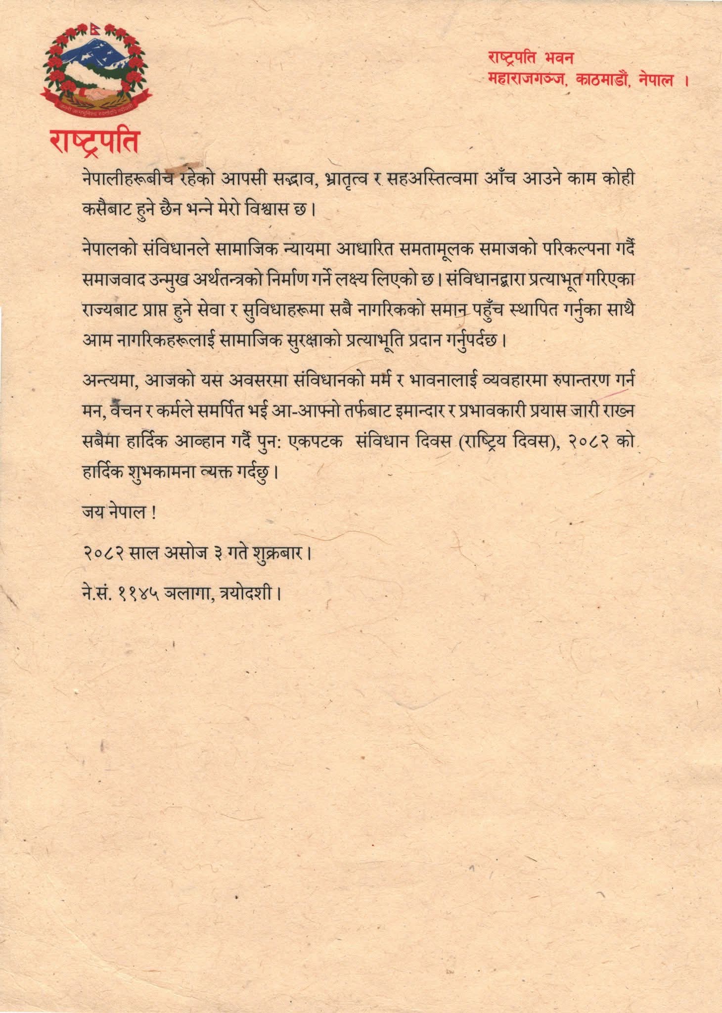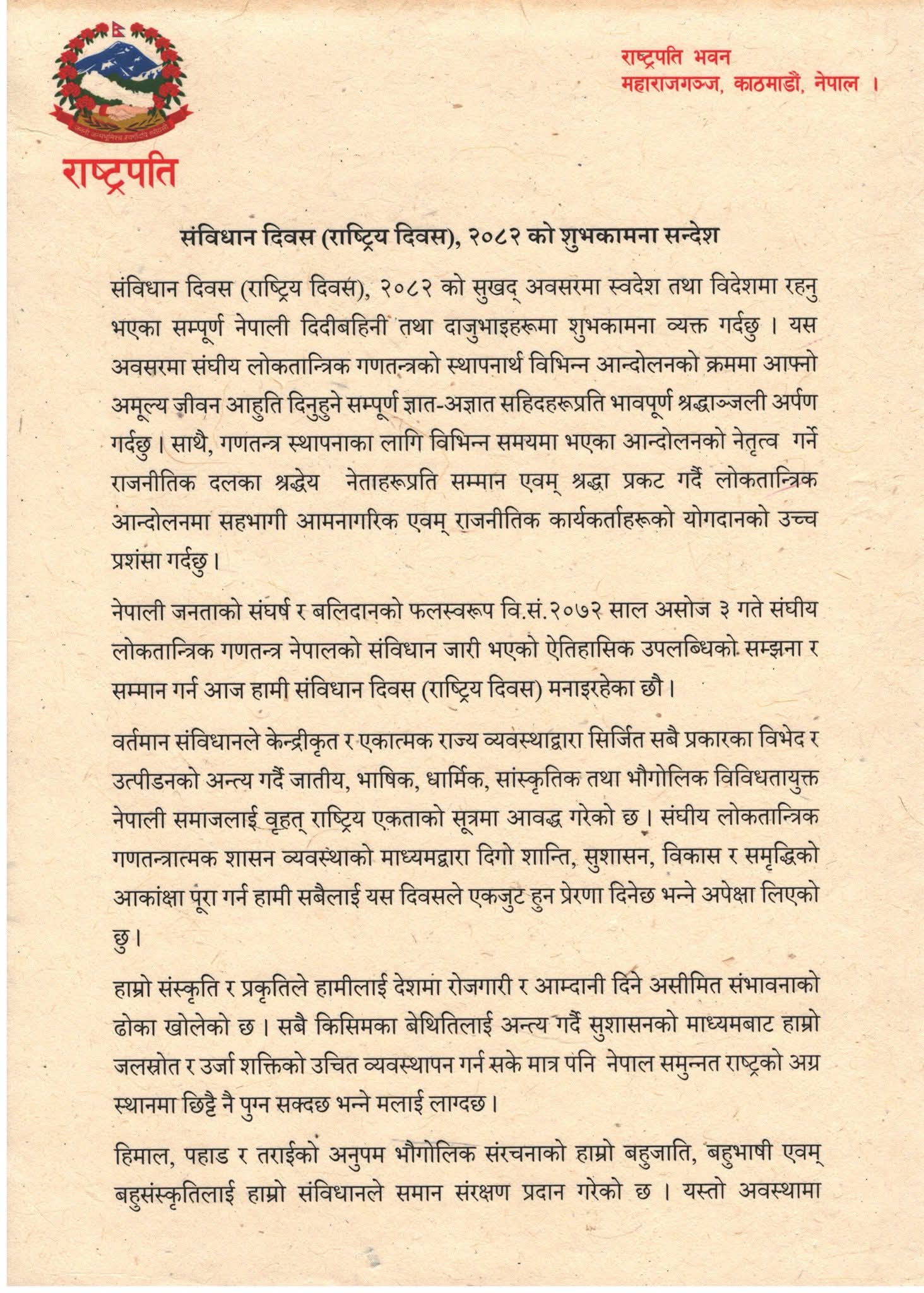 संविधान दिवसका अवसरमा शुभकामना आज (शुक्रबार) सन्देश दिँदै उनले सङ्घीय लोकतान्त्रिक गणतन्त्रात्मक शासन व्यवस्थाको माध्यमद्वारा दिगो शान्ति, सुशासन, विकास र समृद्धिको आकाङ्क्षा पूरा गर्न हामी सबैलाई एकजुट हुन प्रेरणा दिनेछ भनी शुभकामना व्यक्त गरेका छन् ।