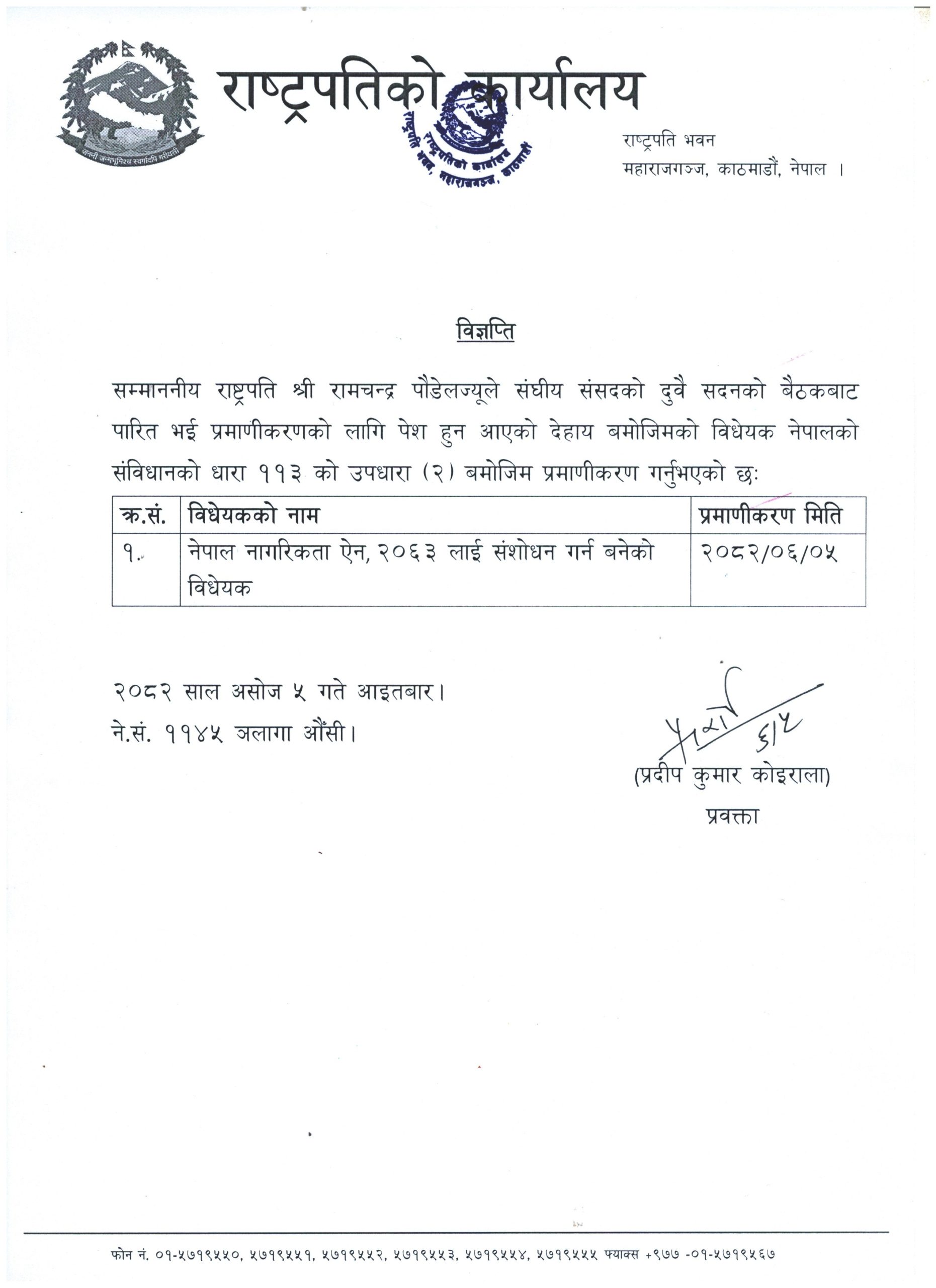 राष्ट्रपति पाैडेलद्वारा नागरिकता विधेयक प्रमाणीकरण
