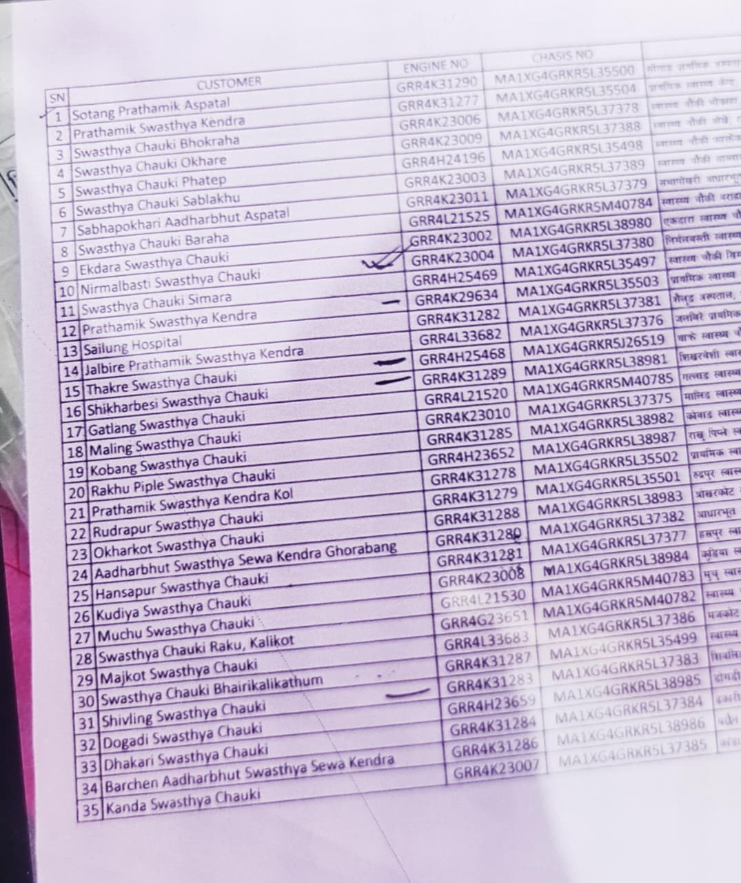 मंगलबार पहिलो चरणमा देशभरिका दुर्गम तथा मापदण्डका आधारमा छनोट गरिएका ३५ गाउँपालिकालाई एम्बुलेन्स वितरण गरिएको काठमाडौं महानगरका स्वास्थ्य विभाग प्रमुख दीपककुमार केसीले जानकारी दिए ।