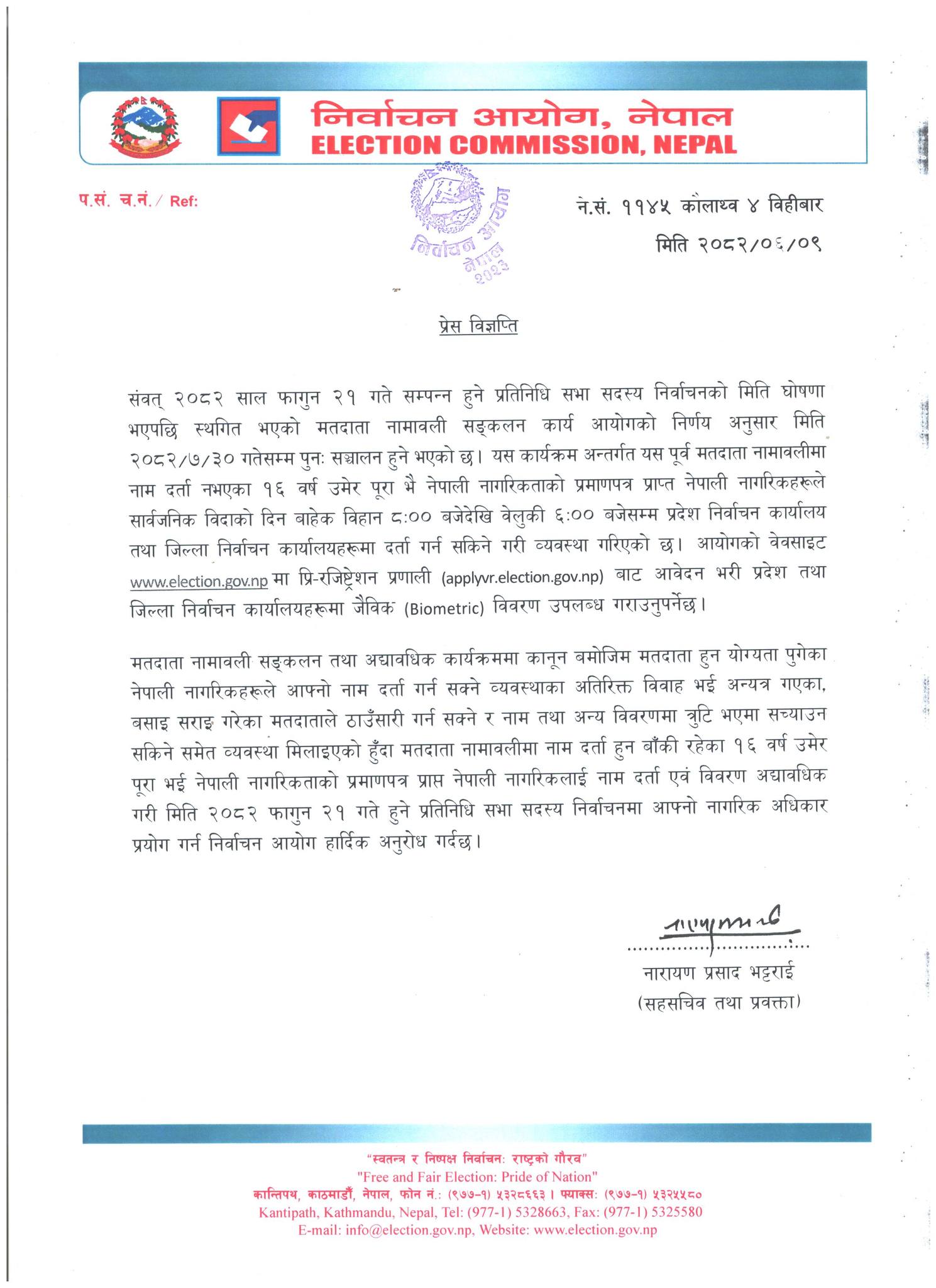 निर्वाचन घोषणापछि मतदाता नामावली संकलन रोकिने व्यवस्था सरकारले अध्यादेशमार्फत परिमार्जन गरेपछि आयोगले नयाँ निर्णय गरेको हो । आउँदो फागुन २१ गते प्रतिनिधि सभा सदस्यको निर्वाचन तोकिएको छ ।