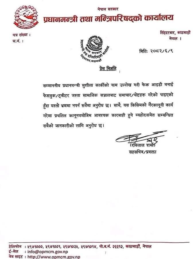 प्रधानमन्त्री तथा मन्त्रिपरिषद्को कार्यालयले प्रधानमन्त्री सुशीला कार्कीको नाम उल्लेख गरी फेक आइडी बनाएर फेसबुक र ट्वीटरबाट समाचार पोस्ट गरेको पाइएको भन्दै आपत्ति जनाएको छ ।