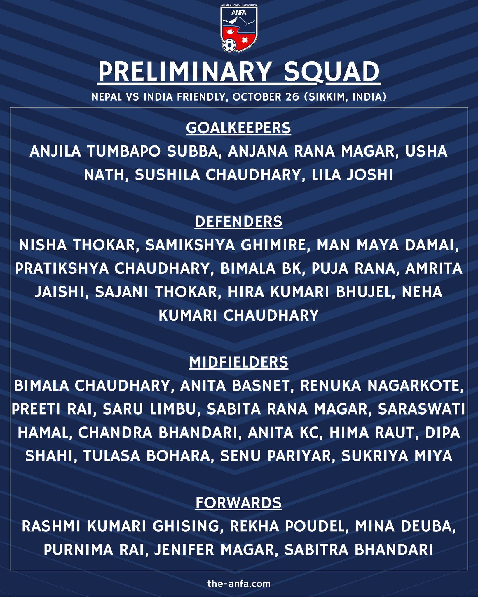 अखिल नेपाल फुटबल सङ्घ (एन्फा) ले भारतसँगको मैत्रीपूर्ण खेलका लागि ३५ जना महिला खेलाडीलाई बन्द प्रशिक्षणमा बोलाएको छ ।