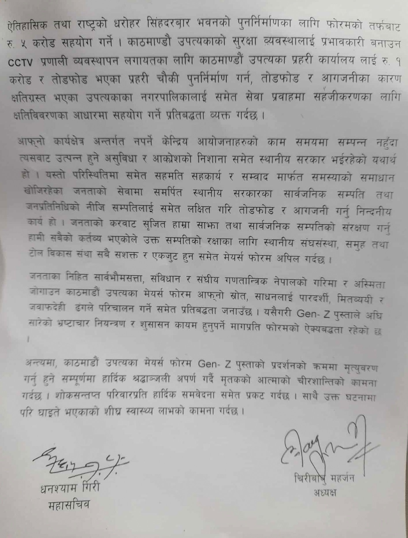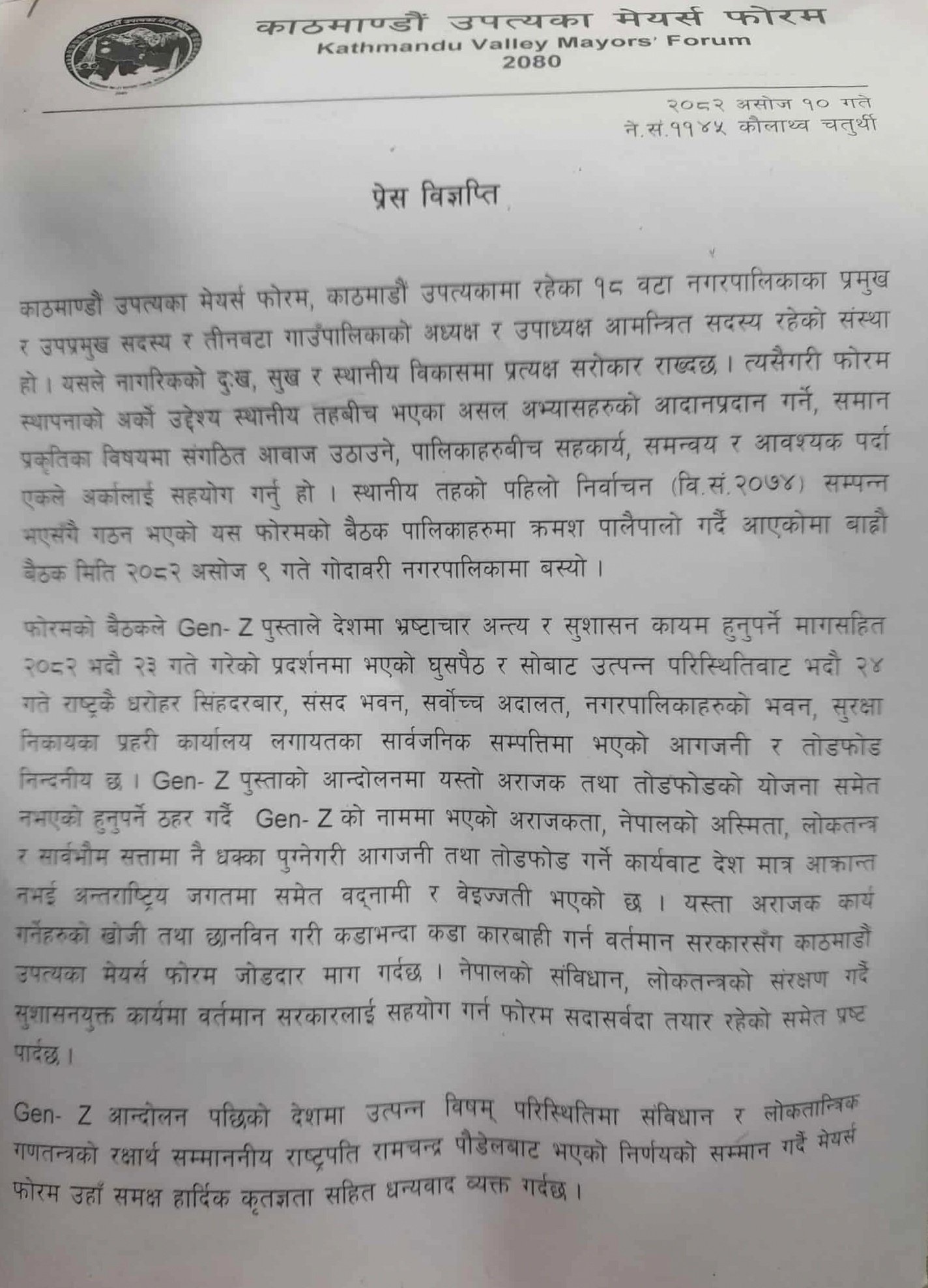 नीजि सम्पत्ति तोडफोड र आगजनी निन्दनीय- काठमाडाैं उपत्यका मेयर्स फोरम