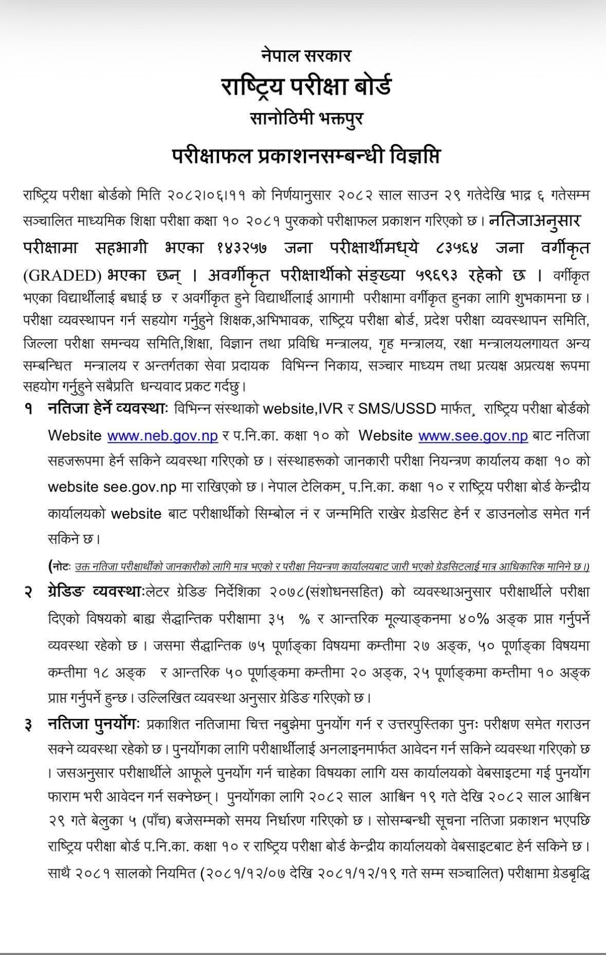 राष्ट्रिय परीक्षा बोर्डले एसइई पूरक परीक्षाको नतिजा सार्वजनिक गरेको छ ।