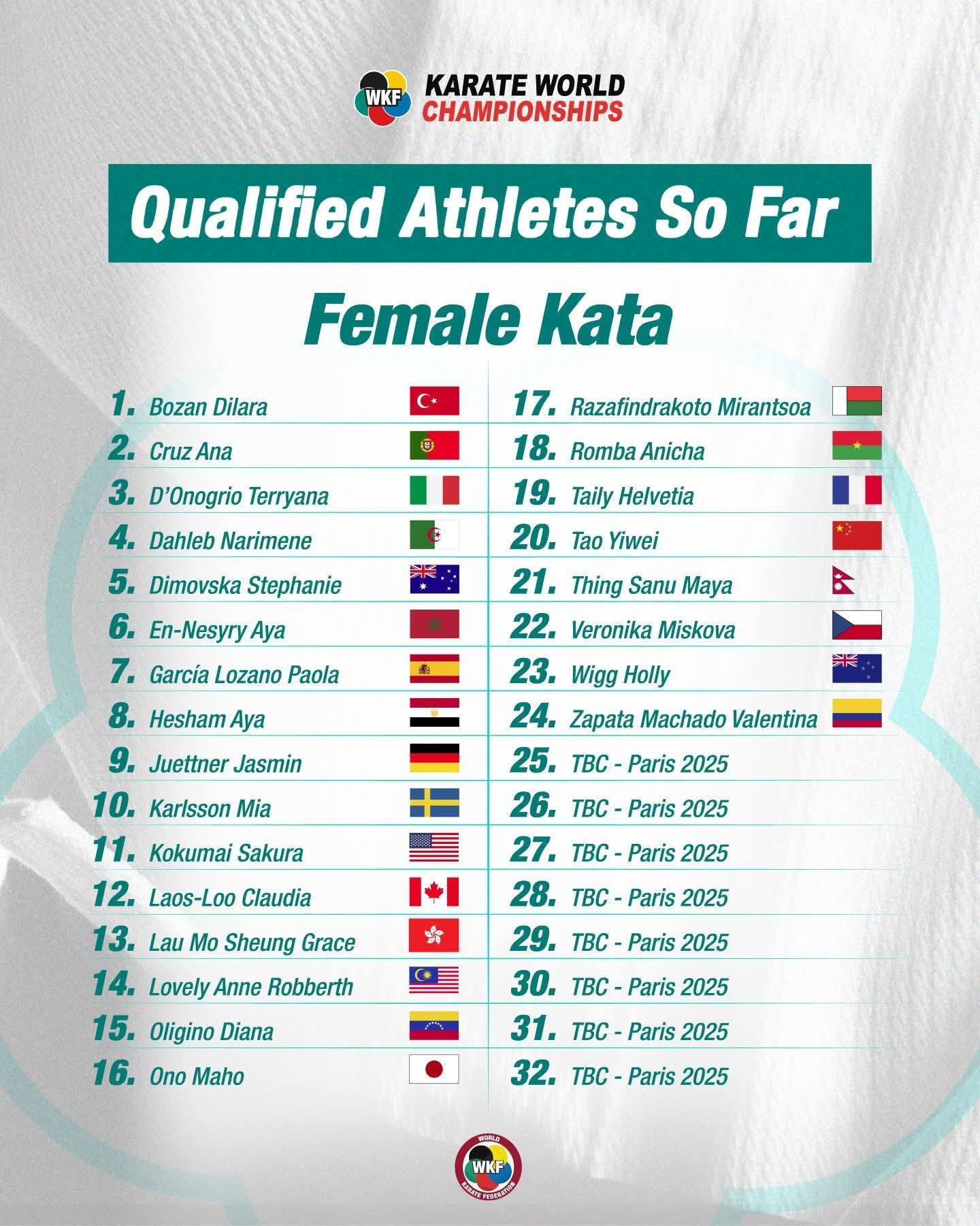 एरिका गुरुङले ६८ केजीमाथि, वर्षा बुढामगरले ५० केजीमुनि, सविना श्रेष्ठले ५५ केजीमुनि र सानुमाया थिङले एकल कातामा प्रतिस्पर्धा गर्नेछन् । प्रशिक्षकमा कुशल श्रेष्ठ छन् । तारा गुरुङले निर्णायकको भूमिका निर्वाह गर्नेछिन् ।