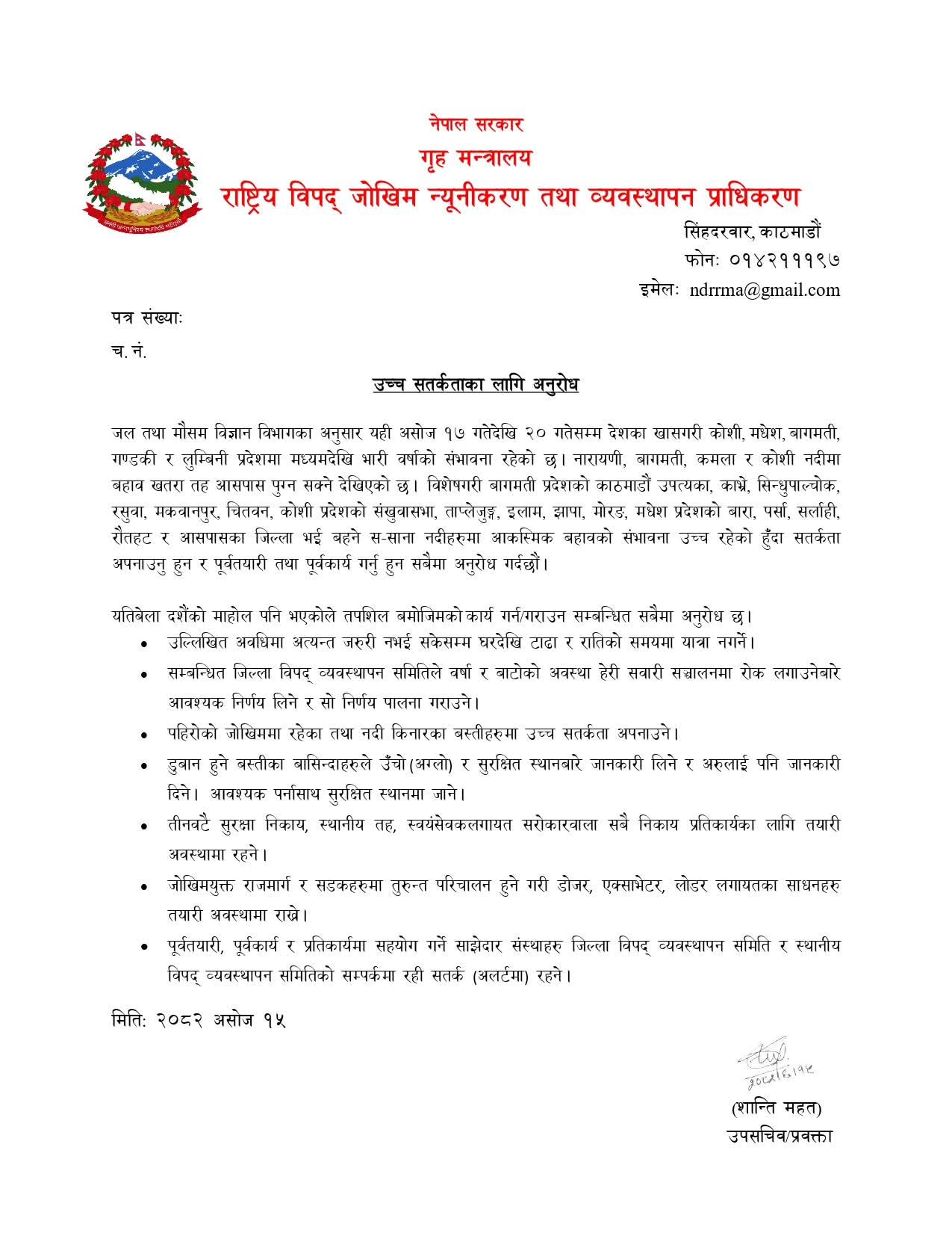 त्यो वर्षाले विशेषगरी बागमती प्रदेशका काठमाडौं उपत्यकासहित काभ्रे, सिन्धुपाल्चोक, रसुवा, मकवानपुर, चितवनमा बाढी, पहिरो र डुबानको जोखिम हुने जनाइएको छ ।