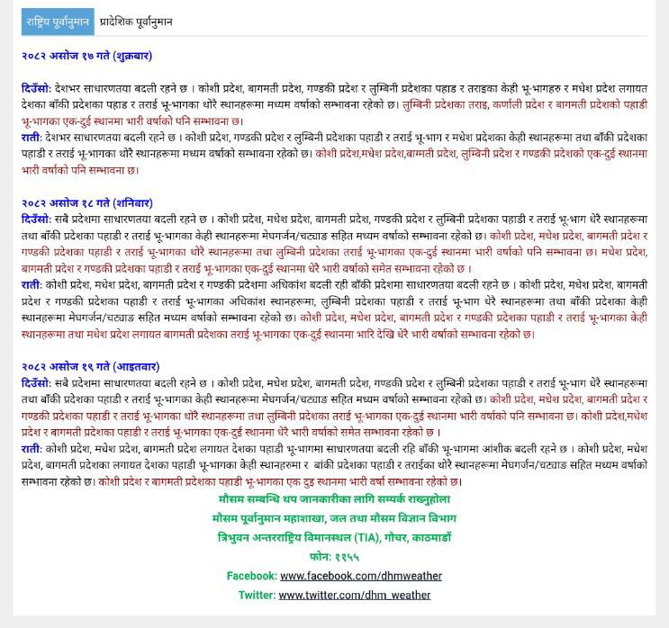 मौसम पूर्वानुमान महाशाखाले पनि यसअघि मौसम बुलेटिन जारी गरी १७ असोजदेखि २० असोजसम्म कोशी, मधेश, बागमती, गण्डकी र लुम्बिनीका विभिन्न जिल्लामा मध्यमदेखि भारी वर्षाको जोखिम रहेकाले सचेतना अपनाउन भनेको छ।