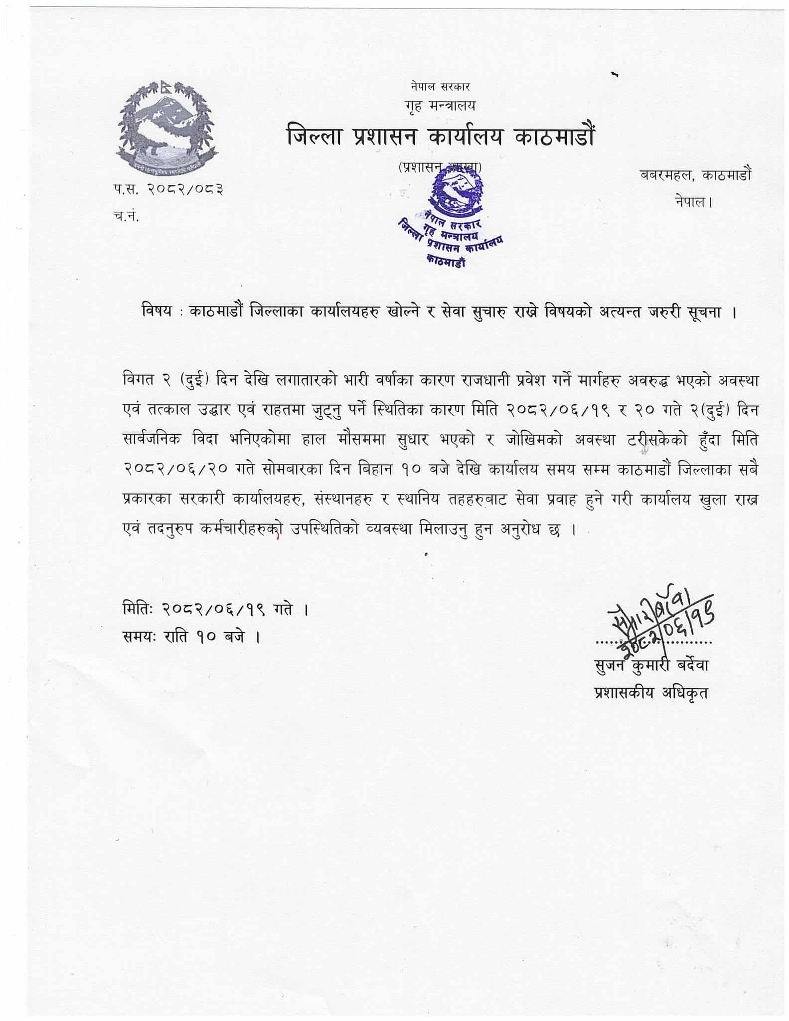 जसअनुसार जिल्ला प्रशासन कार्यालय काठमाडाैंले आज सोमबारबाट सबै कार्यालय खोल्न परिपत्र गरेसँगै चन्द्रागिरि नगरपालिका र मातहतका कार्यालयपनि खुल्ने भएका हुन् ।