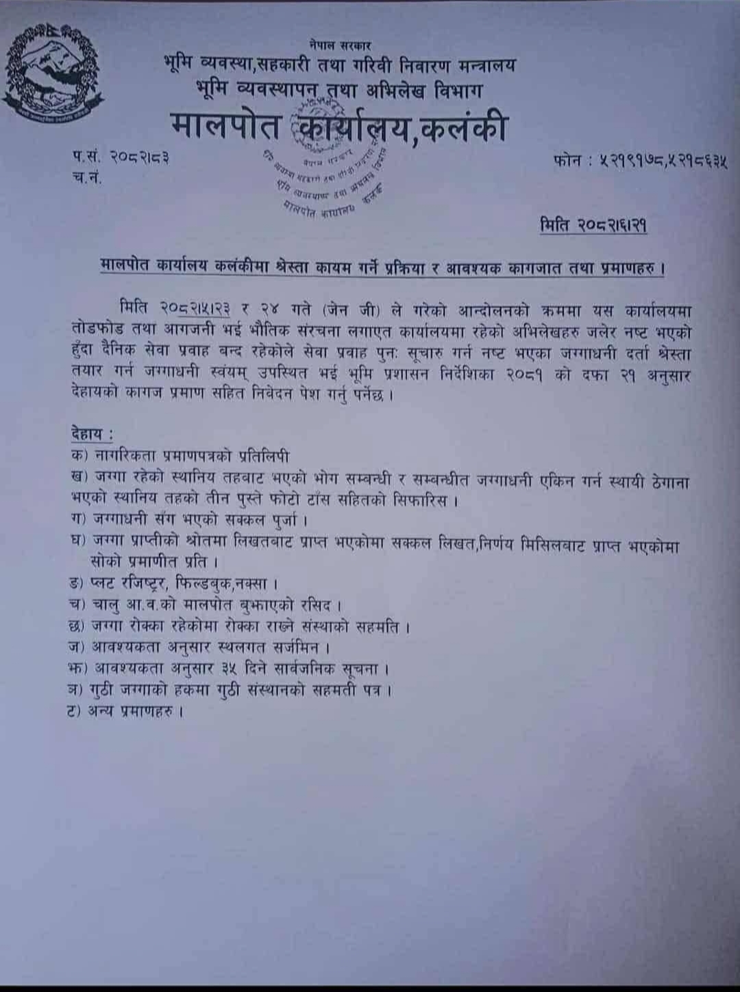 हाल अभिलेख जलेर नष्ट भएकाले दैनिक सेवा प्रवाह बन्द रहेको कार्यालयले जनकारी दिएको छ । सेवा प्रवाह पुनः सूचारु गर्न नष्ट भएका जग्गाधनी दर्ता श्रेस्ता तयार गर्न जग्गाधनी स्वयम् उपस्थित हुनुपर्नेछ । जग्गाधनीले मालपोतमा बुझाउनुपर्ने विवरण यस्तो छ–