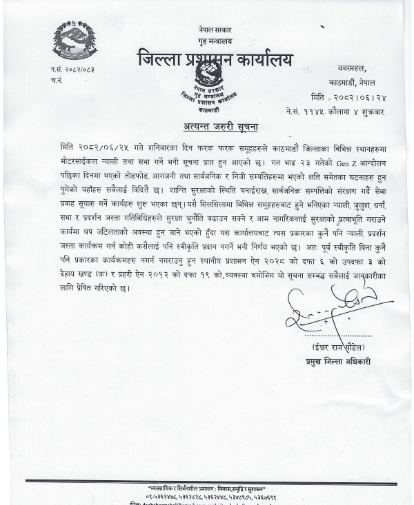 विभिन्न समूहले आयोजना गर्न लागेको भनिएका मोटरसाइकल र्याली तथा प्रदर्शनहरूमा प्रतिबन्ध लगाइएको हो। प्रशासनले शान्ति–सुरक्षा कायम राख्न, सार्वजनिक सम्पत्ति जोगाउन र सेवा प्रवाहमा अवरोध नहोस् भन्ने उद्देश्यले यस्तो निर्णय गरेको जनाएको छ।