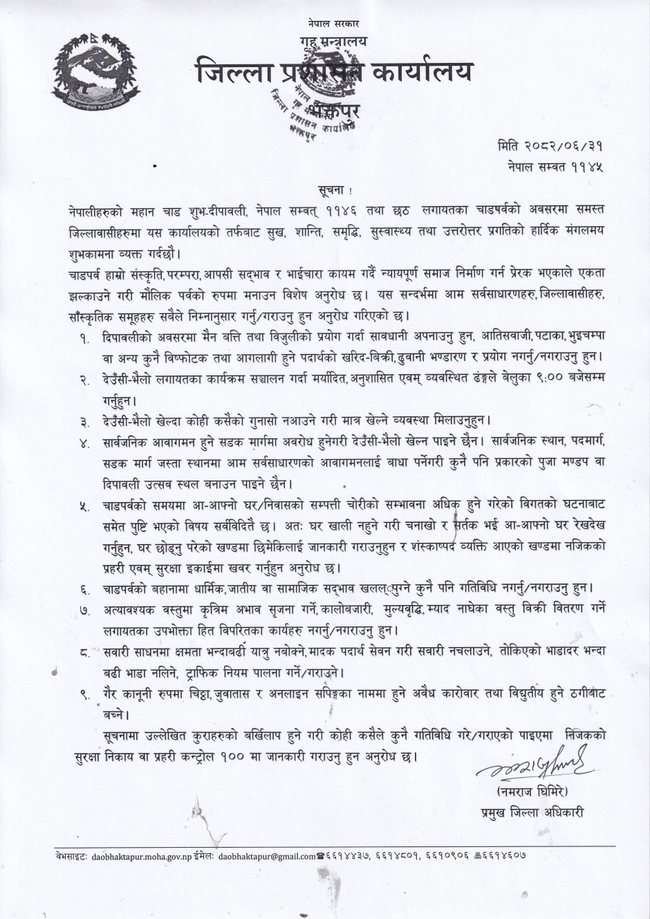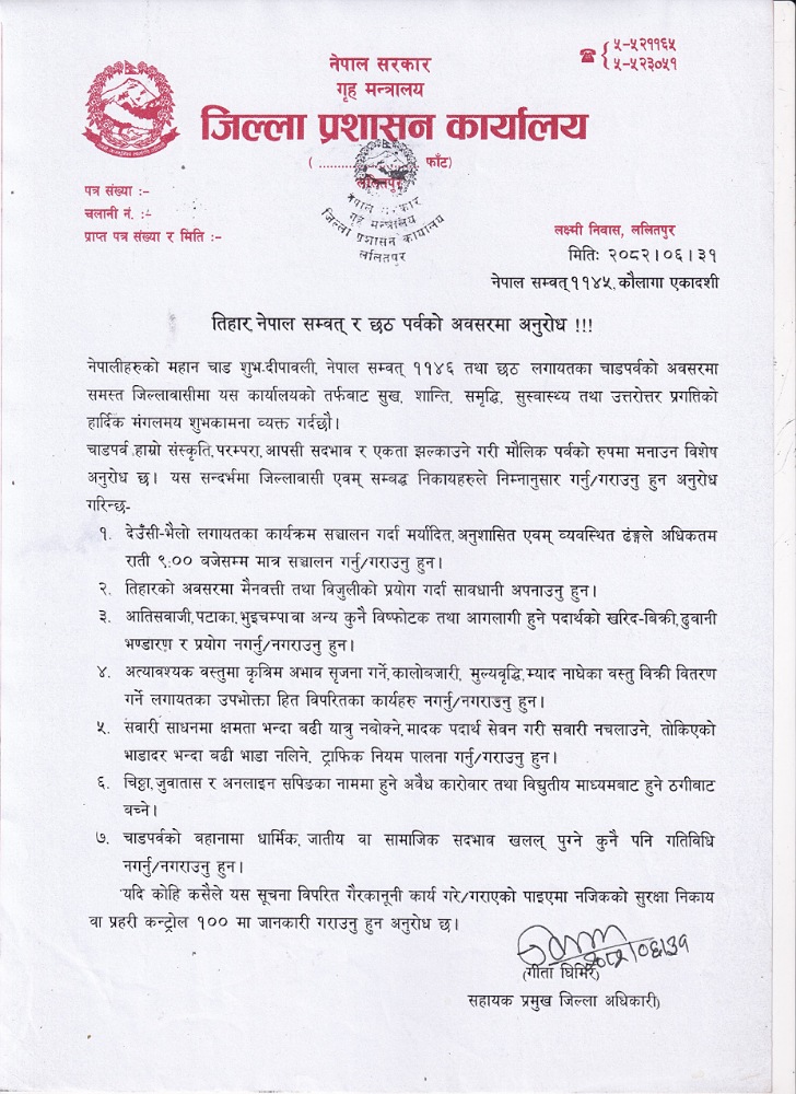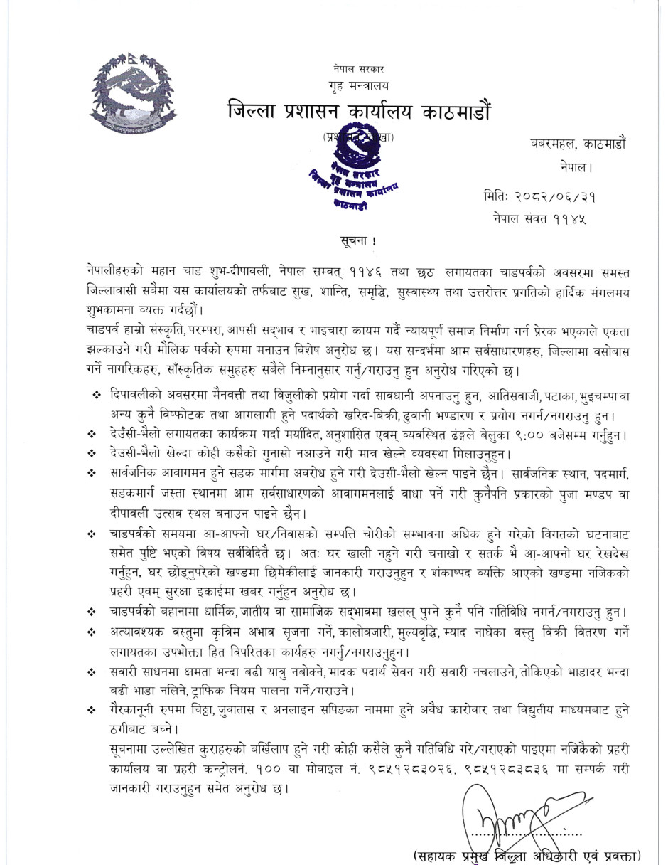 “चाडपर्वको बहानामा धार्मिक, जातीय वा सामाजिक सद्भावमा खलल पुग्ने कुनै पनि गतिविधि नगर्न/नगराउनुहुन,” प्रशासनले भनेको छ, “अत्यावश्यक वस्तुमा कृत्रिम अभाव सिर्जना गर्ने, कालोबजारी, मूल्यवृद्धि, म्याद नाघेका वस्तु बिक्री वितरण गर्नेलगायतका उपभोक्ता हितविपरीतका कार्यहरू नगर्नु/नगराउनुहुन ।”