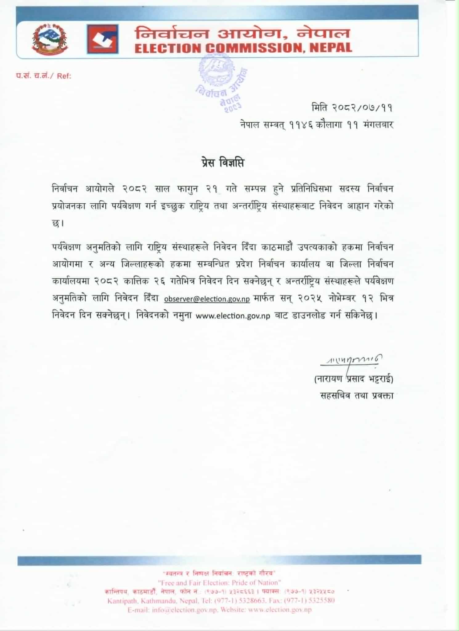 फागुन २१ मा हुने निर्वाचन पर्यवेक्षणका लागि निवेदन दिन निर्वाचन आयोगको आह्वान