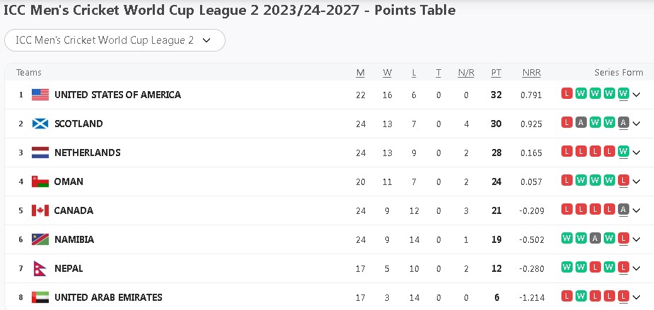लिग–२ शृङ्खलामा नेपाल र आयोजक संयुक्त युएईलाई हराएपछि अमेरिका तालिकाको शीर्षस्थानमा छ ।