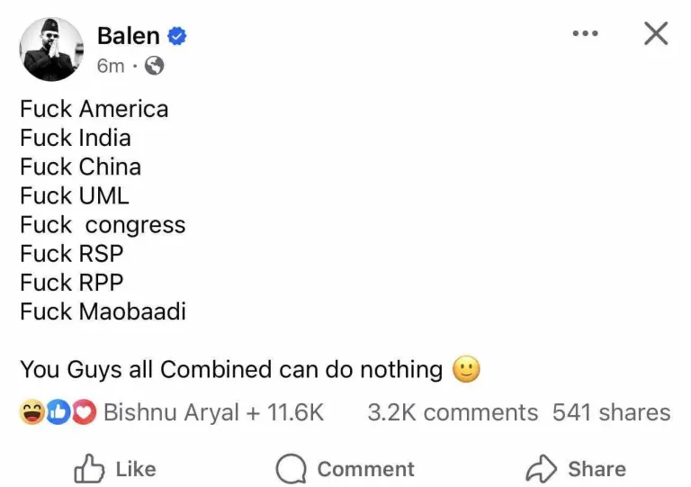 शनिबार मध्यराति सामाजिक सञ्जालमार्फत उनले लेखेको स्टाटसमा प्रयोग गरिएका शब्दले नयाँ राजनीतिक र कूटनीतिक तरंग ल्याएको छ। उक्त स्टाटसमा बालेनले दुई छिमेकी मुलुक-चीन र भारतसँगै अमेरिका र नेपालका प्रमुख राजनीतिक दलहरूको नाम उल्लेख गर्दै आलोचनात्मक अभिव्यक्ति दिएका थिए।