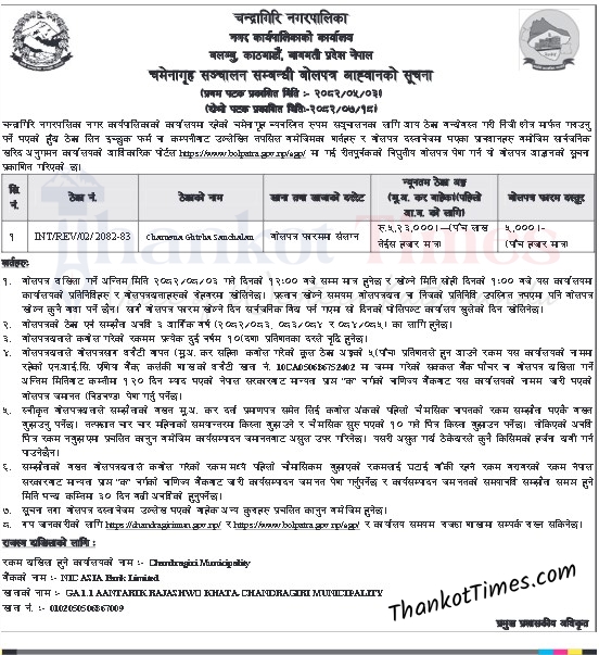 बलम्बुस्थित चन्द्रागिरि नगर कार्यपालिकाको कार्यालयले सो कार्यालय हातामा चमेना गृह (क्यान्टिन) सञ्चालनका लागि दोश्रो पटक कोटेशन आह्वान गरेको छ ।