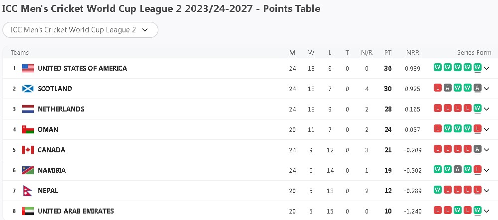 जितसँगै यूएई समान खेलबाट १० अङ्कसहित अन्तिम स्थानमा छ । २४ खेलमा ३६ अंकसहित अमेरिका तालिकाको पहिलो स्थानमा छ ।