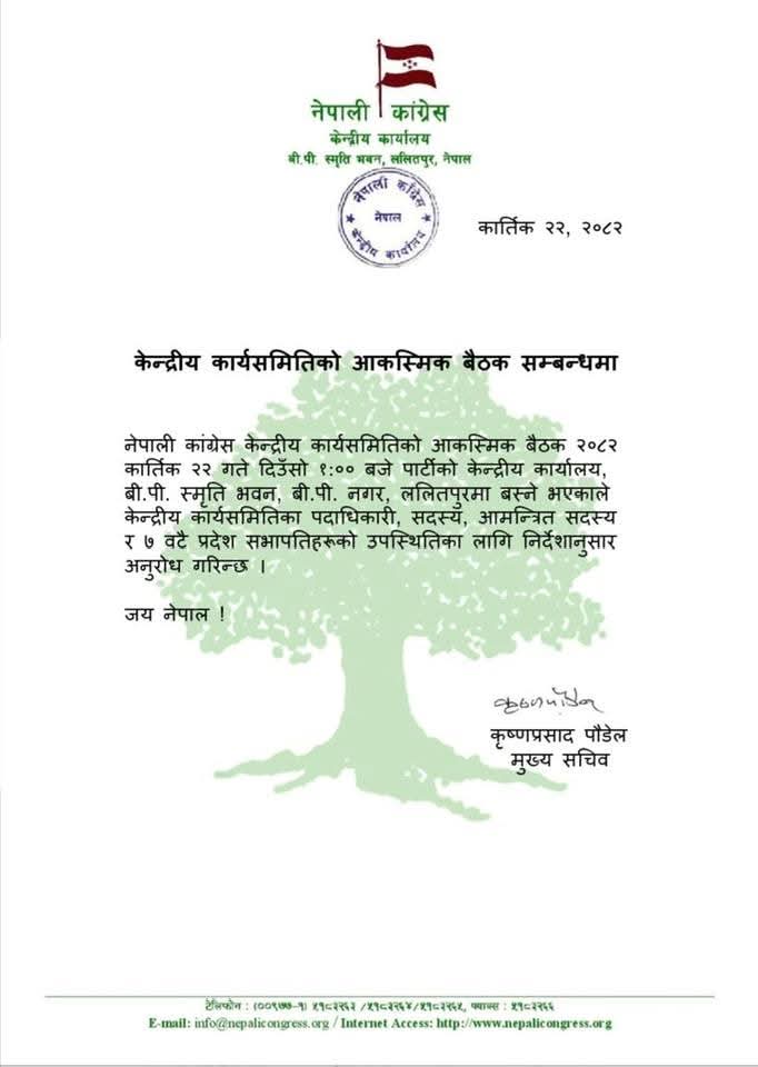 नेपाली काँग्रेसले केन्द्रीय कार्यसमितिको आकस्मिक बैठक बोलाएको छ ।