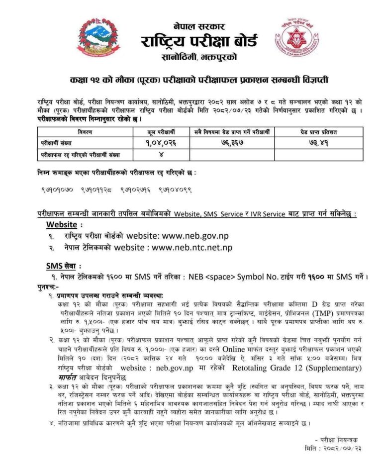 कक्षा १२ को पूरक परीक्षाको नतिजा सार्वजनिक भएको छ ।