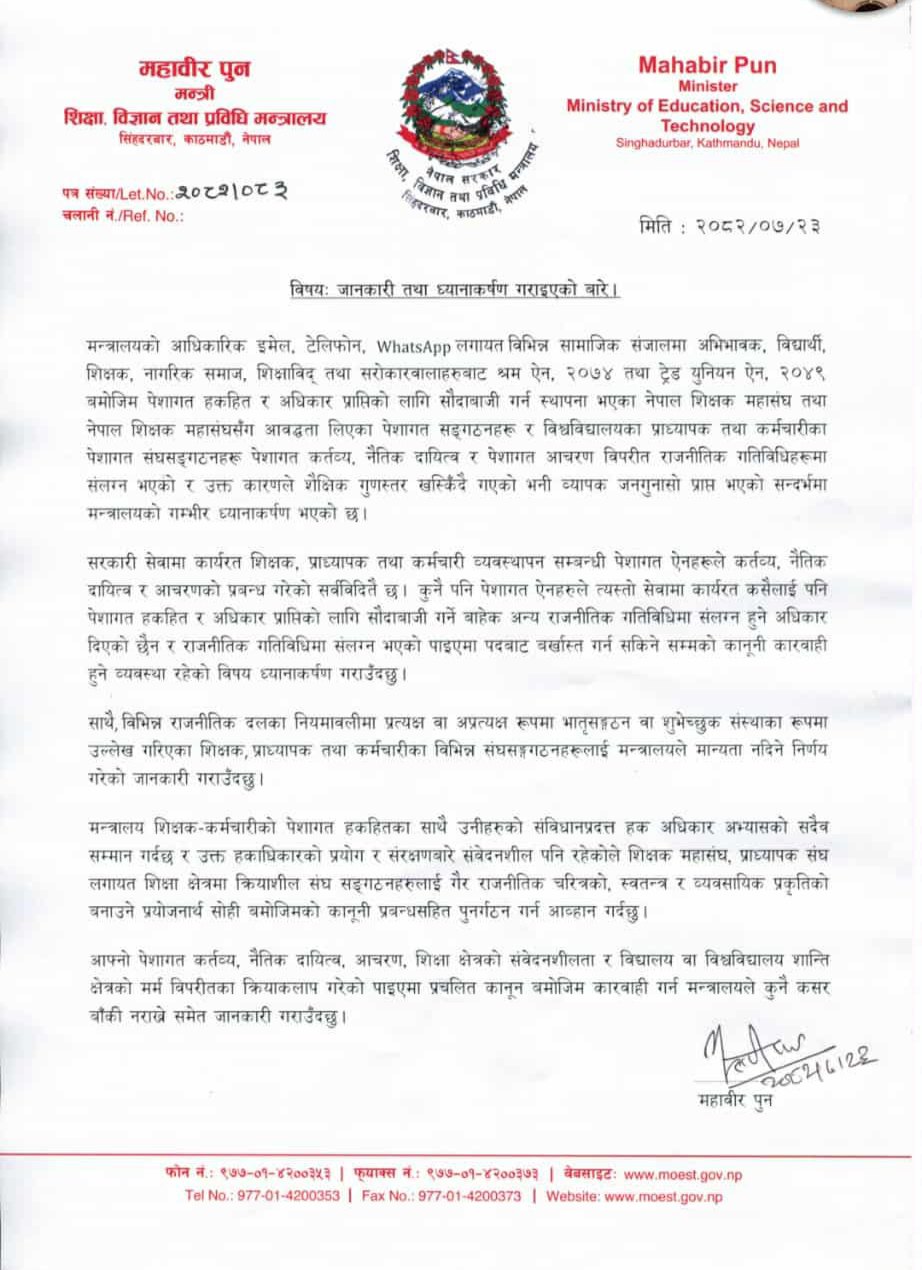 मन्त्री पुनले आइतबार ध्यानाकर्षण पत्र जारी गर्दै भनेका छन्, “सरकारी सेवामा कार्यरत शिक्षक, प्राध्यापक तथा कर्मचारी व्यवस्थापनसम्बन्धी पेसागत ऐनहरूले कर्तव्य, नैतिक दायित्व र आचरणको प्रबन्ध गरेको सर्वविदितै छ । कुनै पनि पेसागत ऐनहरूले त्यस्तो सेवामा कार्यरत कसैलाई पनि पेसागत हकहित र अधिकार प्राप्तिको लागि सौदाबाजी गर्नेबाहेक अन्य राजनीतिक गतिविधिमा संलग्न हुने अधिकार दिएको छैन र राजनीतिक गतिविधिमा संलग्न भएको पाइएमा पदबाट बर्खास्त गर्न सकिने सम्मको कानुनी कारबाही हुने व्यवस्था रहेको विषय ध्यानाकर्षण गराउँदछु ।”