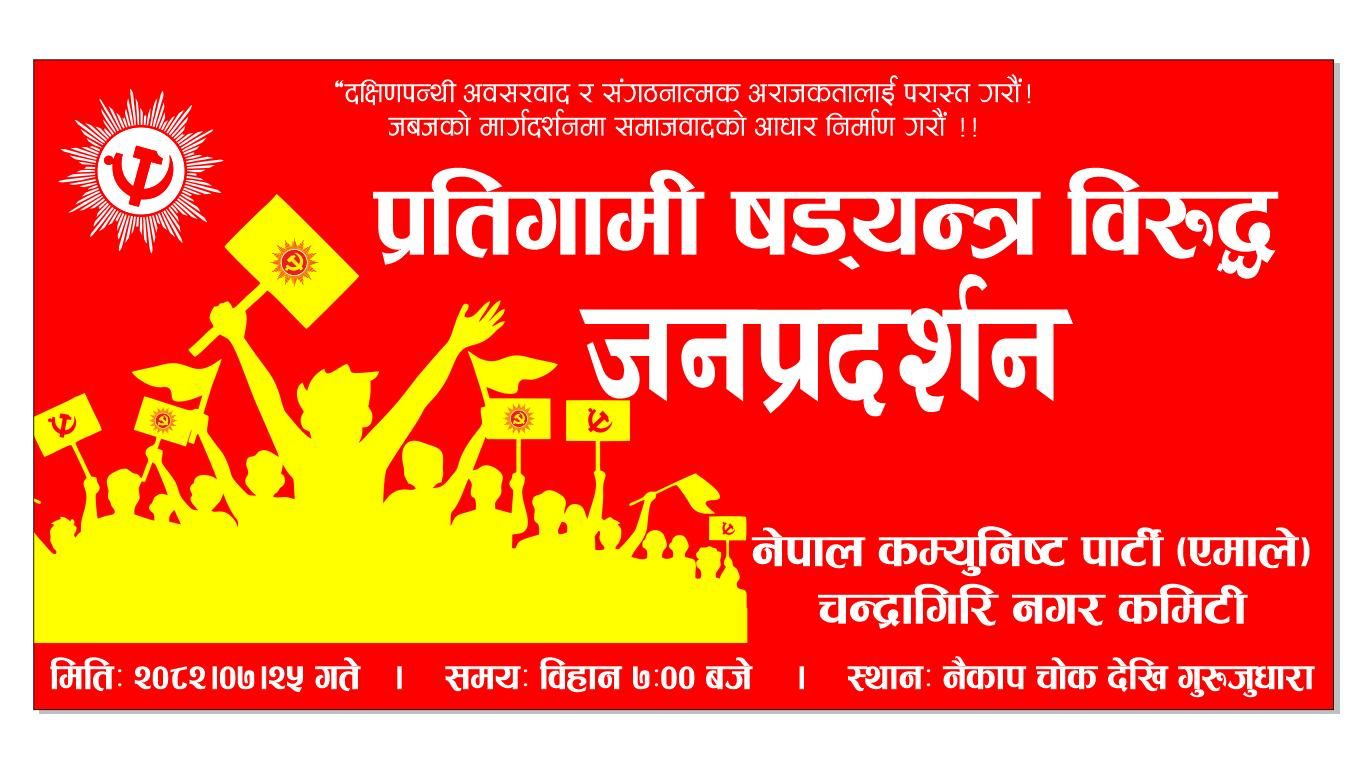 नेकपा एमाले चन्द्रागिरि नगर कमिटिले भोलि (कार्तिक २५) मंगलबार प्रतिगामी षडयन्त्रविरुद्ध जनप्रदर्शन गर्ने भएको छ ।