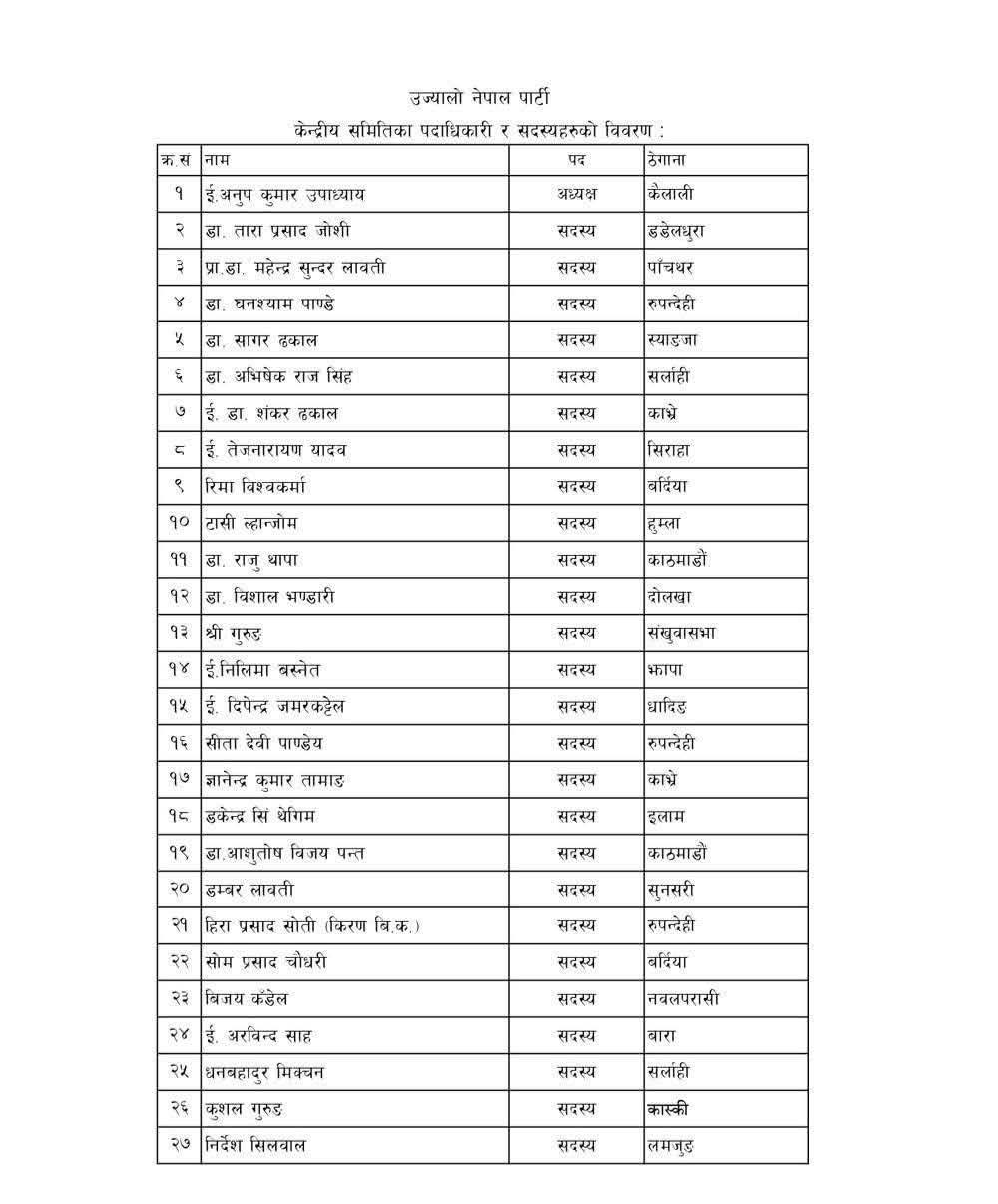 उज्यालो नेपाल पार्टीले निर्वाचन आयोगमा बुझायो केन्द्रीय कमिटी सदस्यहरूको सूची