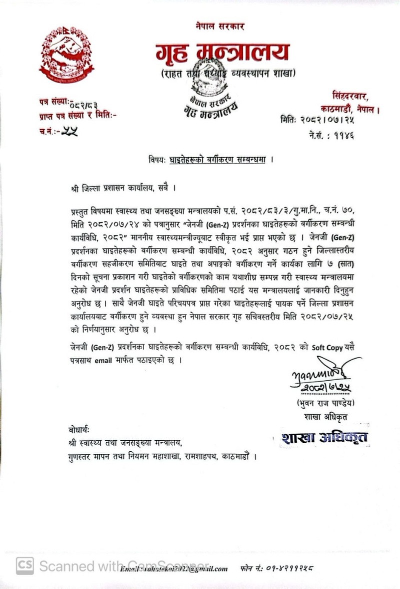 गृह मन्त्रालयको राहत तथा तथ्याङ्क व्यवस्थापन शाखाले गरेको परिपत्रअनुसार, स्वास्थ्य तथा जनसङ्ख्या मन्त्रालयबाट स्वीकृत ‘जेनजी प्रदर्शनका घाइतेहरूको वर्गीकरण सम्बन्धी कार्यविधि, २०८२’ कार्यान्वयन गर्न निर्देशन दिइएको हो । परिपत्रमा जिल्लास्तरीय वर्गीकरण सहजीकरण समिति गठन गरी सात दिनको सार्वजनिक सूचना निकालेर गरेर घाइते तथा अपाङ्गता भएका व्यक्तिहरूको वर्गीकरणको काम तत्काल सम्पन्न गर्न भनिएको छ ।