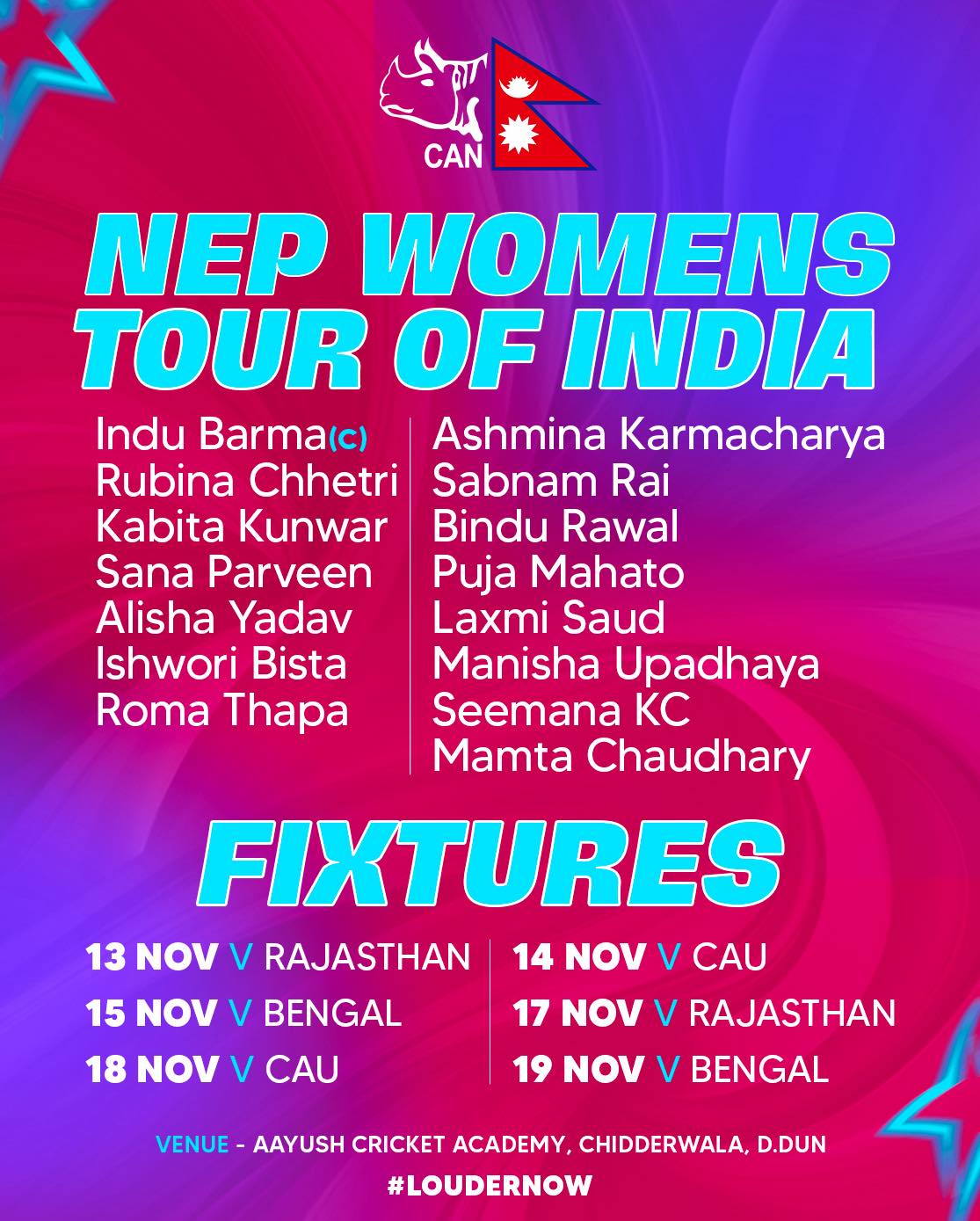 नेपालले भारतको राजस्थान, पश्चिम बङ्गाल र उत्तराखण्डसँग ६ खेल खेल्ने तालिका रहेको नेपाल क्रिकेट सङ्घ (क्यान) का केन्द्रीय सदस्य वीरेन्द्रबहादुर चन्दले जानकारी दिनुभयो । उहाँका अनुसार नेपालले पहिलो खेल भोलि राजस्थानसँग खेल्नेछ ।