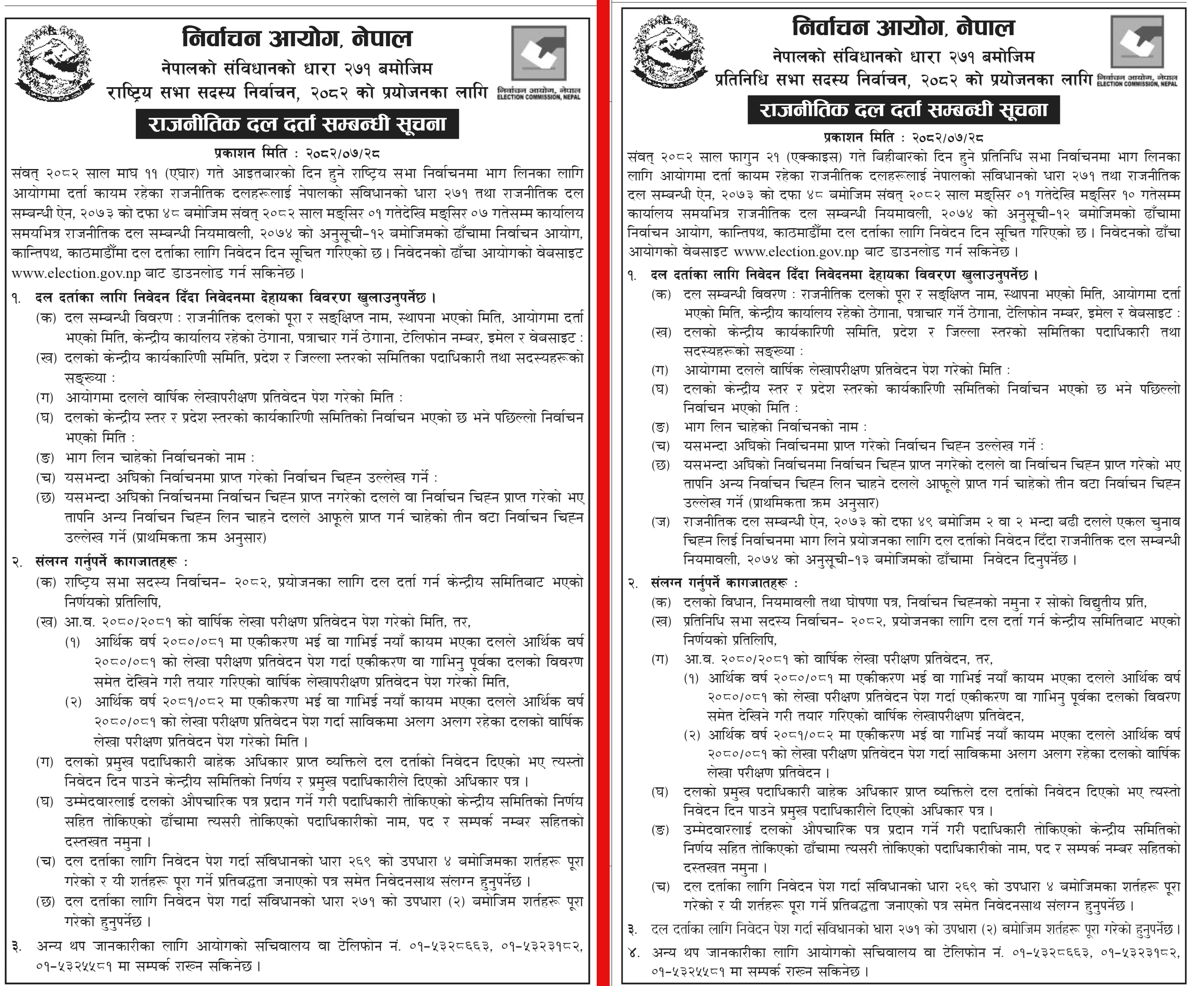 निर्वाचन आयोगले प्रतिनिधि सभा निर्वाचन र राष्ट्रिय सभा निर्वाचनका लागि दल दर्ता आह्वान गरेको छ ।