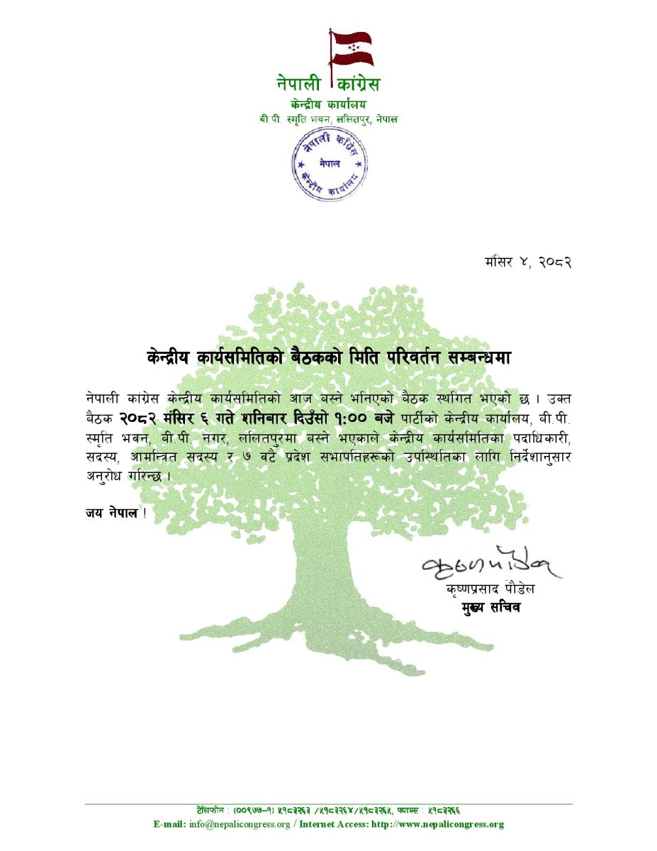 नेपाली कांग्रेस केन्द्रीय कार्यसमितिको बैठक फेरि स्थगित
