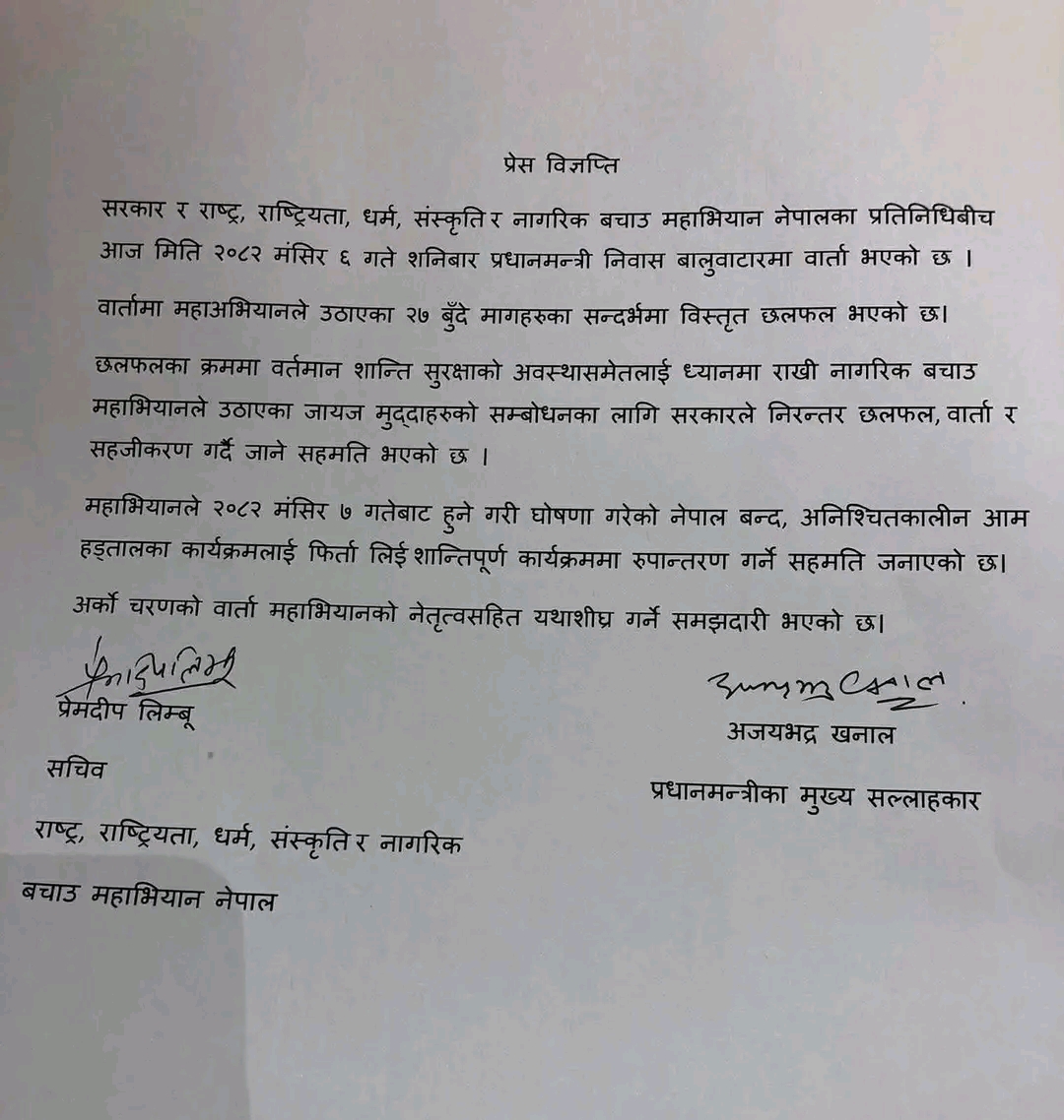 वार्तामा महाअभियानले उठाएका २७ बुँदे मागका सन्दर्भमा विस्तृत छलफल भएको र निरन्तर छलफल, वार्ता तथा सहजीकरण गर्दै सहमति भएको विज्ञप्तिमा उल्लेख छ । शान्ति सुरक्षाको अवस्थालाई ध्यानमा राखी अभियानले उठाएका जायज मुद्दाहरूको सम्बोधनका लागि सरकारले निरन्तर छलफल, वार्ता र सहजीकरण गर्ने सहमति गरेको छ ।