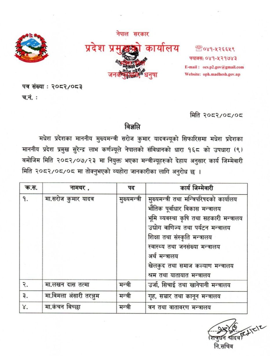 मधेस प्रदेशका मुख्यमन्त्री सरोज कुमार यादवले मन्त्रीहरूको कार्य विभाजन गरेका छन् ।
