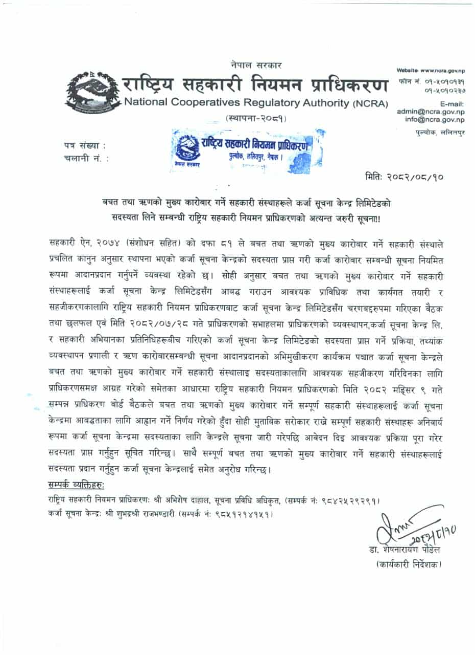 सहकारी ऐन, २०७४ (संशोधनसहित) को दफा ८१ ले बचत तथा ऋणको मुख्य कारोबार गर्ने सहकारी संस्थाले प्रचलित कानुनअनुसार स्थापना भएको कर्जा सूचना केन्द्रको सदस्यता प्राप्त गरी कर्जा कारोबारसम्बन्धी सूचना नियमित रूपमा आदानप्रदान गर्नुपर्ने व्यवस्था छ । सोही नियमअनुसार बचत तथा ऋणको मुख्य कारोबार गर्ने सहकारी संस्थाहरूलाई कर्जा सूचना केन्द्र लिमिटेडको सदस्यता लिन प्राधिकरणले निर्देशन गरेको हो ।