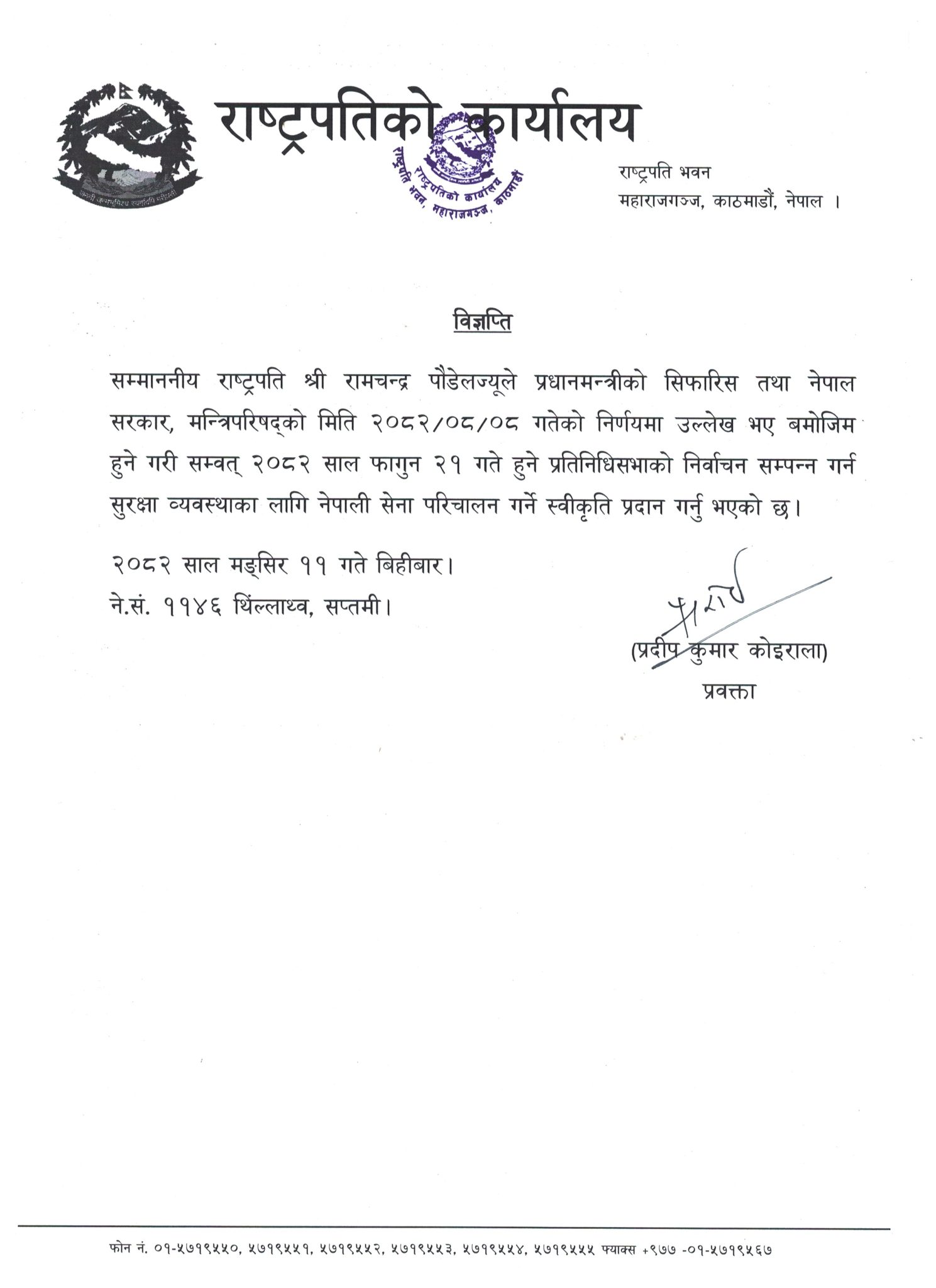 राष्ट्रपति रामचन्द्र पौडेलले प्रतिनिधिसभा निर्वाचनका लागि नेपाली सेना परिचालन गर्ने स्वीकृति प्रदान गरेसँगै उक्त निर्णय कार्यान्वयनमा गएको छ ।