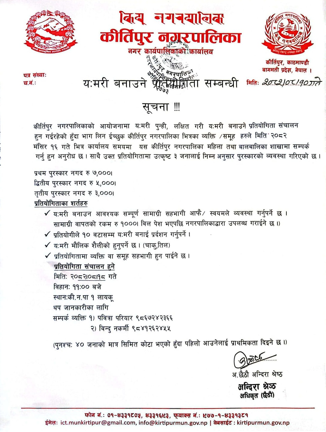 कीर्तिपुर नगरपालिकाको आयोजनामा मंसिर १८ गते कीर्तिपुर नगरपालिका १ लायकूमा प्रतियोगिता सञ्चालन हुने बताइएको छ ।