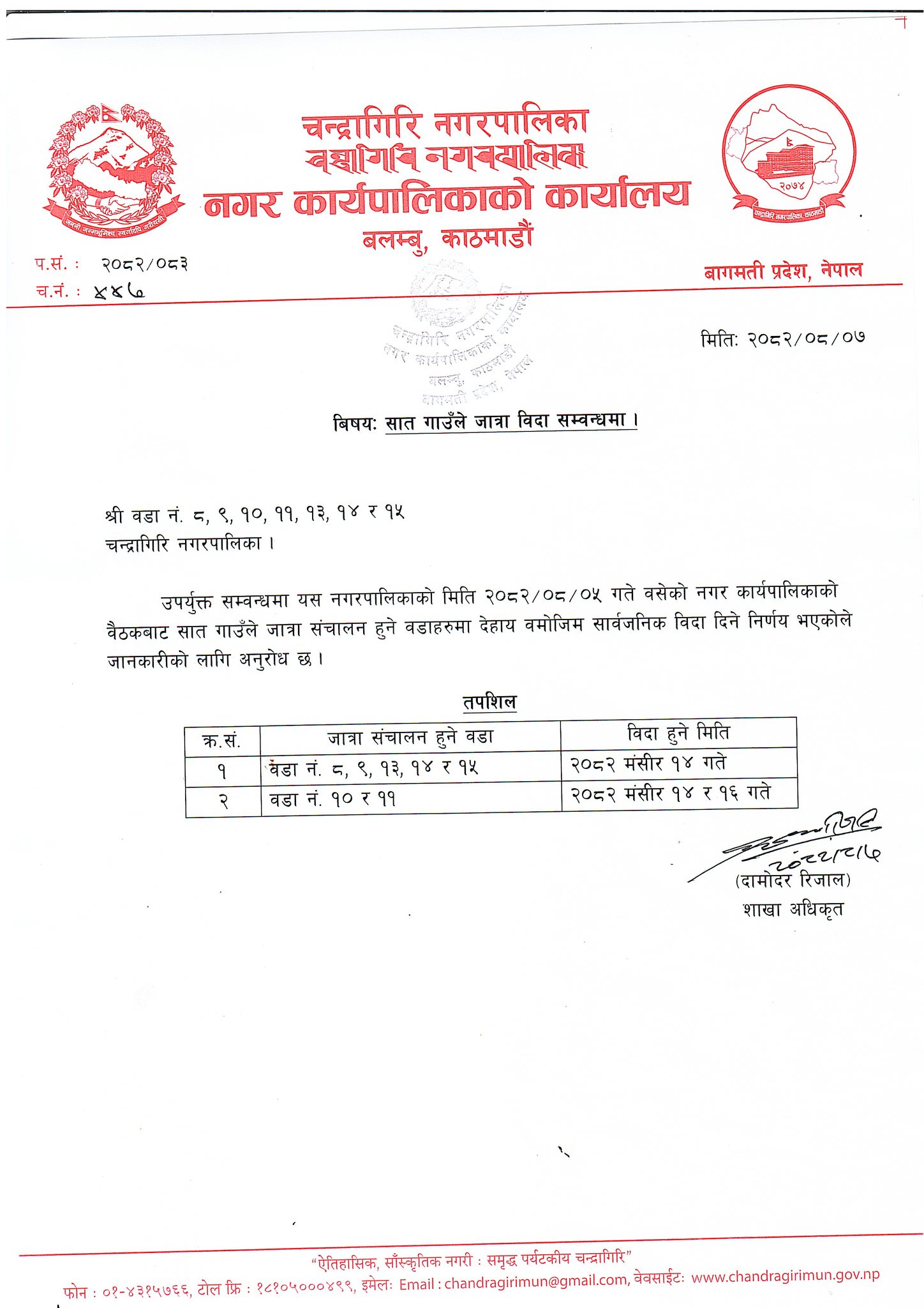 चन्द्रागिरि नगरपालिकाले सात गाउँले जात्राका अवसरमा नगर क्षेत्रका विभिन्न ७ वडामा सार्वजनिक बिदा दिएको छ ।