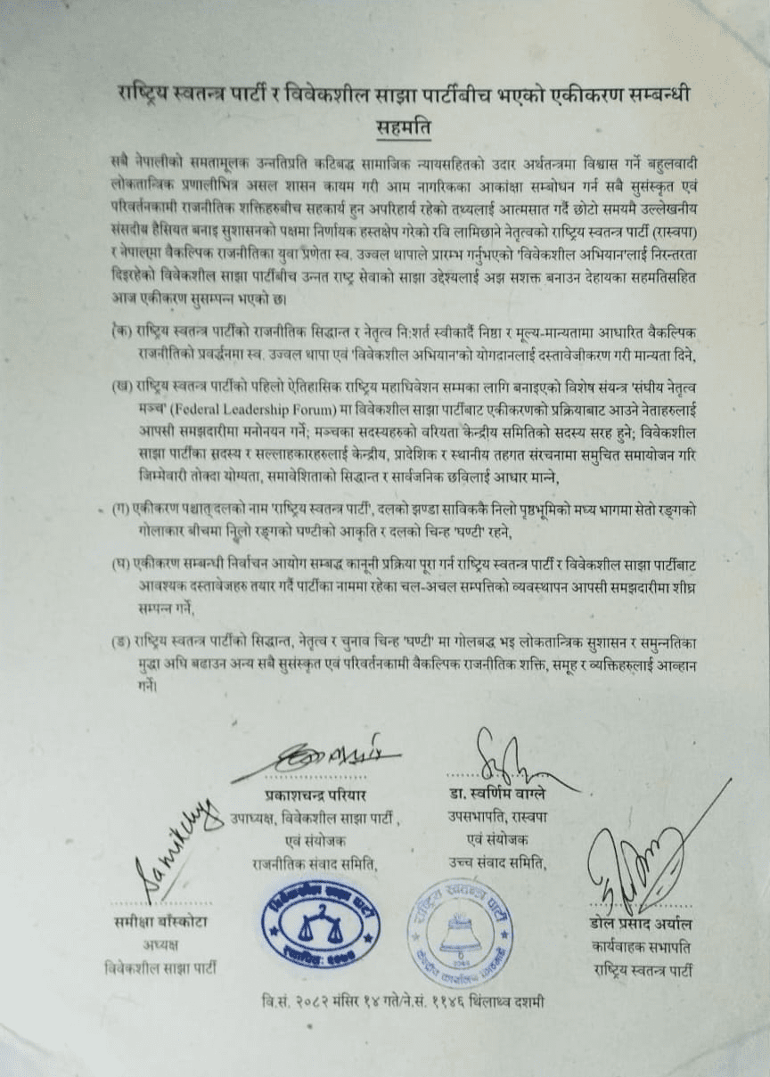 उक्त सहमति पत्रमा रास्वपाका तर्फबाट कार्यवाहक सभापति डोल प्रसाद अर्याल र उपसभापति एवं उच्च संवाद समितिका संयोजक डा. स्वर्णिम वाग्लेले हस्ताक्षर गरेका छन् भने विवेकशील साझाका तर्फबाट अध्यक्ष समीक्षा बाँस्कोटा र उपाध्यक्ष एवं राजनीतिक संवाद समितिका संयोजक प्रकाशचन्द्र परियारले हस्ताक्षर गरेका छन्।