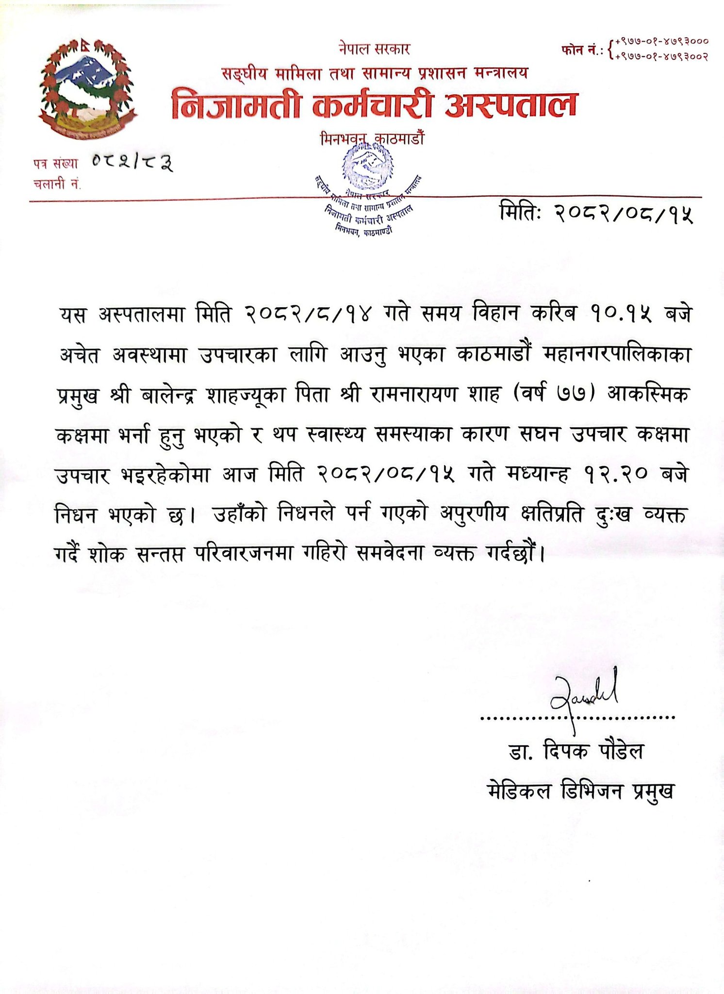 काठमाडाैं महानगरका मेयर बालेन्द्र शाहलाई पितृशोक