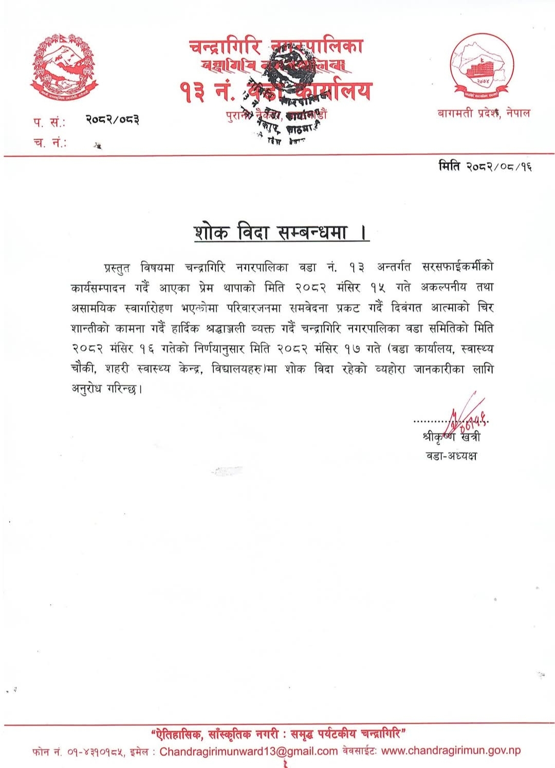 मंगलबार (मंसिर १६) एक सूचना जारी गर्दै वडा कार्यालयले सो वडा क्षेत्रका सफाईकर्मी प्रेम थापाको निधन भएको शोकमा बुधबार ( मंसिर १७ गते) वडा क्षेत्रमा शोक बिदा दिने निर्णय भएको जनाएको हो ।