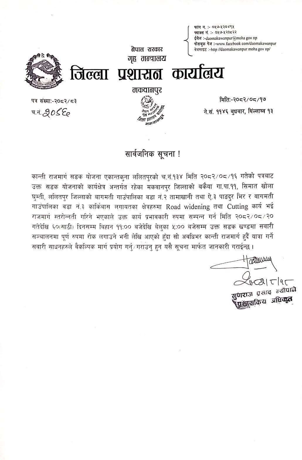 कान्ति लोकपथमा विभिन्न भागमा सडक चौडा बनाउन र वर्षा याममा गएको पहिरो पन्छाउन लागि शनिवारदेखि अर्थात् मंसिर २० गतेबाट बिहान ११ बजेदेखि अपराह्न ५ बजेसम्म सवारी साधन आउजाउ गर्न रोक लगाएको हो ।