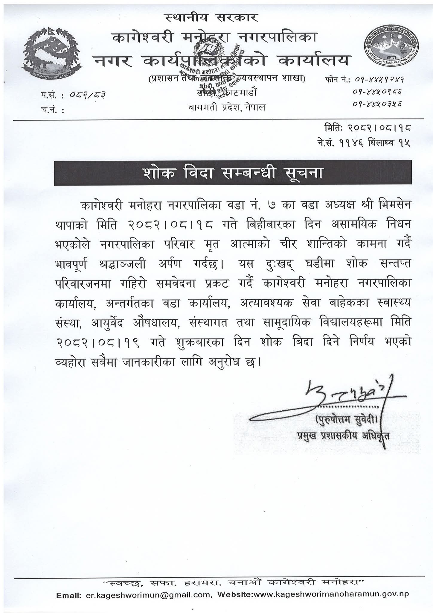 वडाध्यक्ष थापाको निधनमा नगरपालिकाले शोक विज्ञप्ति जारी गरी पालिका अन्तर्गतका वडा कार्यालय, अत्यावश्यक सेवा बाहेकका स्वास्थ्य संस्था, आयुर्वेद औषधालय, संस्थागत तथा सामुदायिक विद्यालयमा आज बिदा दिएको जनाएको छ ।