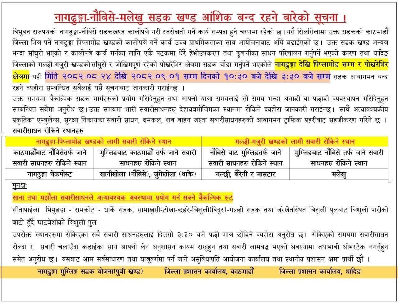 नागढुंगा-नौबिसे-मलेखु सडक खण्ड आंशिक बन्द रहने बारे आयोजनाले सूचना जारी गर्दै सो जनाएको हो ।