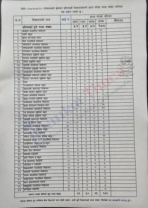 बुधबार सम्पन्न भएका खेलहरूसँगै पदक तालिकामा ३० विद्यालयले कुनै न कुनै पदक हात पारेका छन् । २१ विद्यालयले कम्तीमा १ स्वर्ण प्राप्त गरेका छन् ।