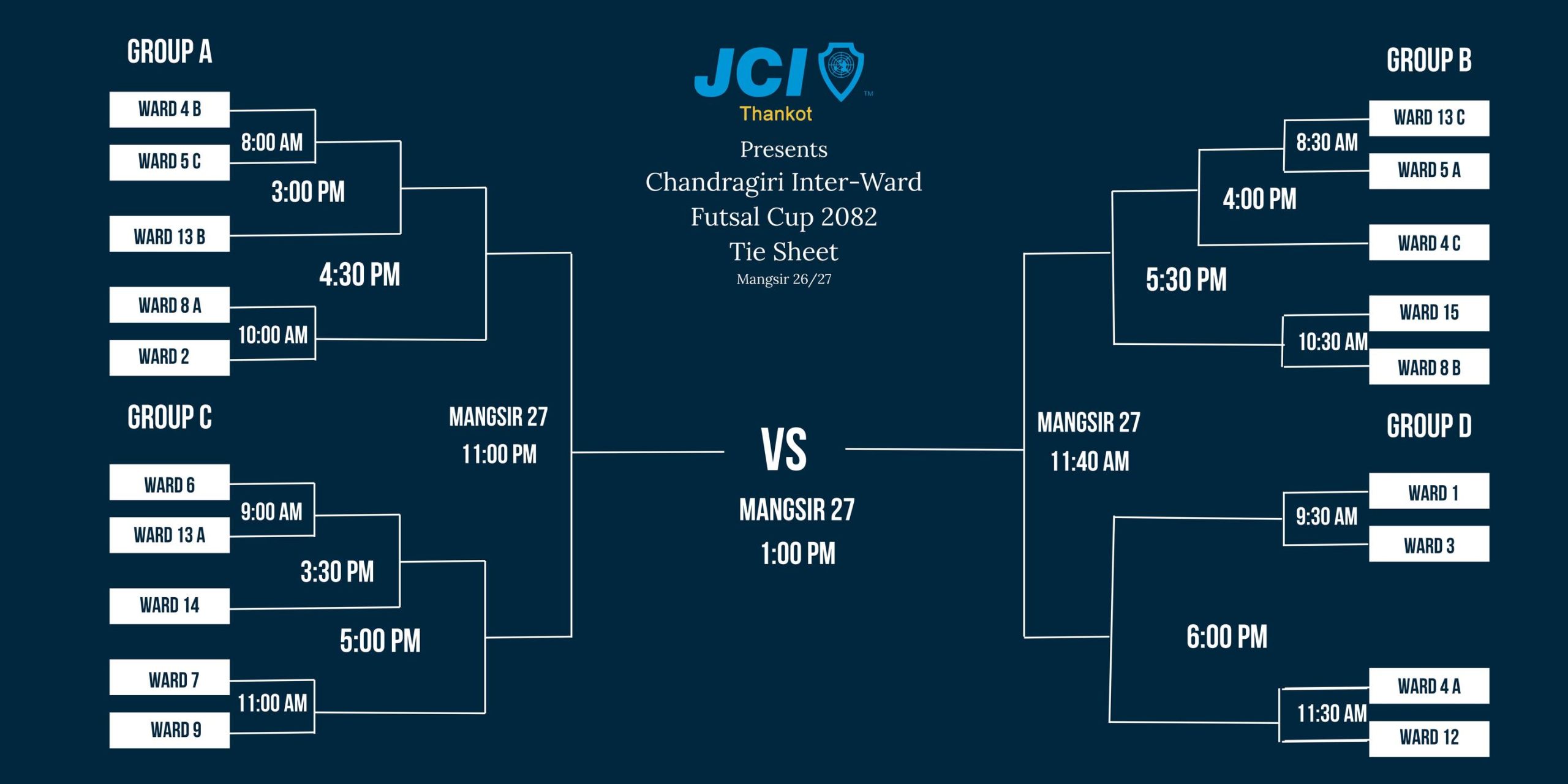 शुक्रबार बिहान ८ बजे हुने उद्घाटन खेलमा वडा नं. ४ को बी टिम र वडा नं. ५ को सी टिमबीच प्रतिस्पर्धा हुनेछ । प्रतियोगिताको पहिलो दिन १५ खेल हुनेछ । सेमीफाइनल र फाइनल खेल भने मंसिर २७ गते शनिबार सोही एरिनामा हुने तालिका रहेको छ ।