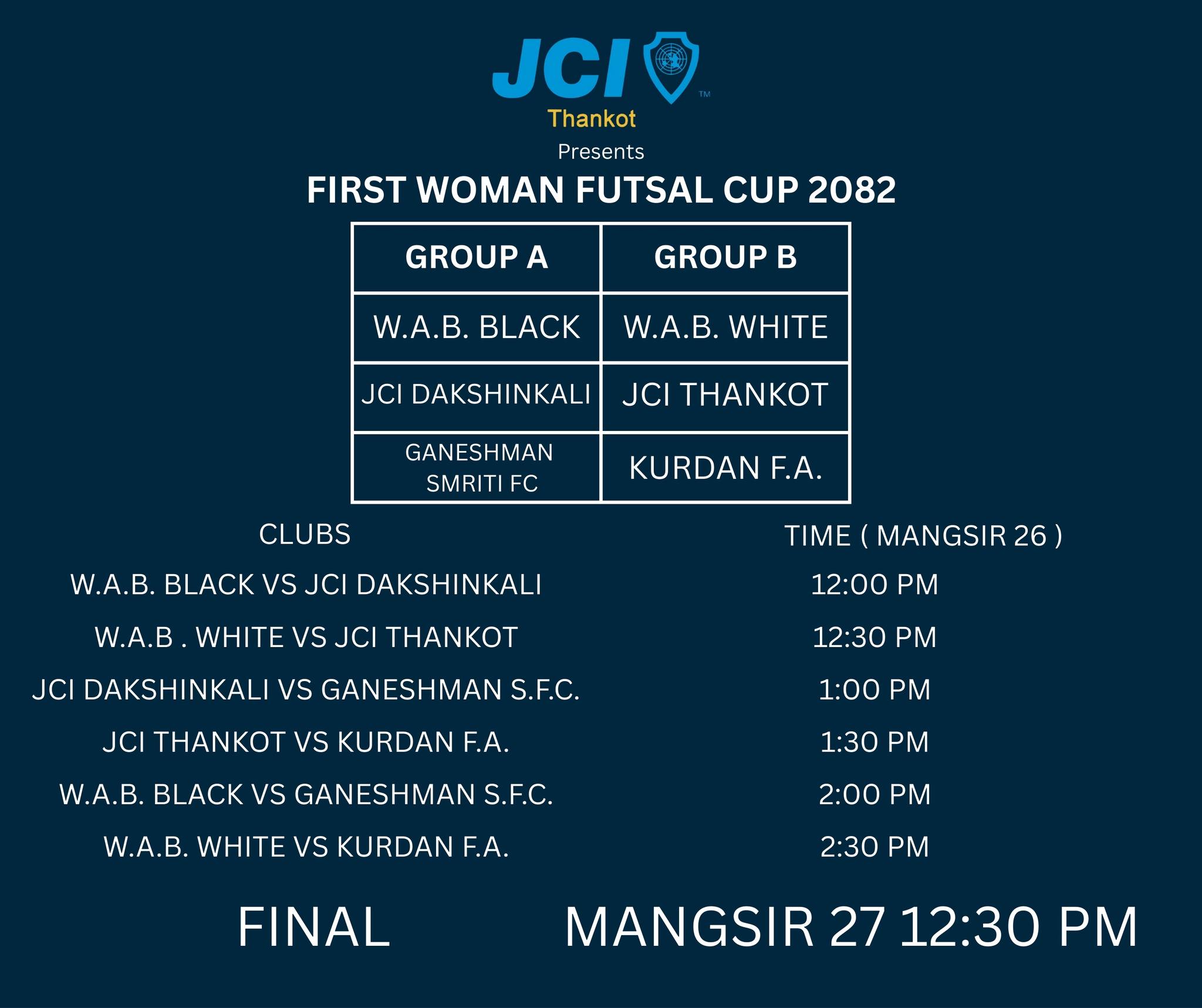 यस्तै, थानकोट जेसीजकै आयोजनामा भोलिबाटै महिला फुटबसल समेत सुरु हुनेछ । जसमा विभिन्न ६ टोलीले भाग लिने बताइएको छ । जसमा पनाैती जेसीज, दक्षिणकाली जेसीज, वीआर व्रदर्श सेतो, वीआर व्रदर्श कालो, कुर्दन फुटबल एकेडेमी र गणेशमान सिंह स्मृति फुटसल रहेका छन् । यो प्रतियोगिताको उपाधि विजेताले २५ हजार रुपैयाँ तथा उपविजेताले १० हजार रुपैयाँ पुरस्कार पाउने थानकोट जेजीजका अध्यक्ष विराज शाहीले जानकारी दिए ।