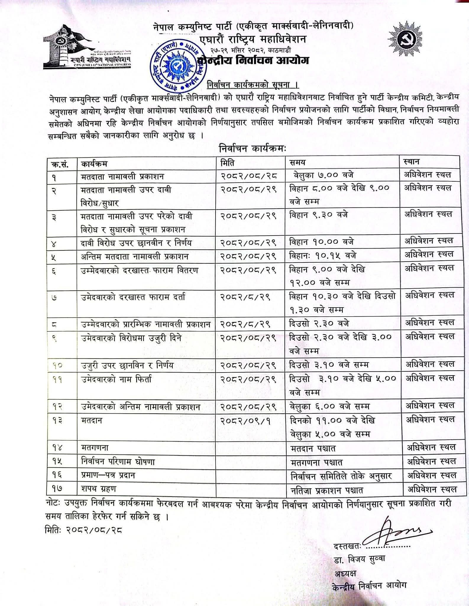एमालेकाे निर्वाचन तालिका सार्वजनिक, आज मतदाता नामावली प्रकाशन, पुस १ मा मतदान कार्यक्रम